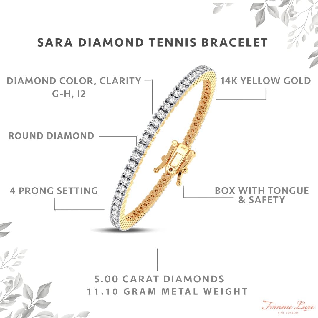 Femme Luxe Sara Diamond Tennis Bracelet for Women (5.00 Carats, G-H Color, I2 Clarity), 14K Gold, with Gift Box, Giftable Jewelry