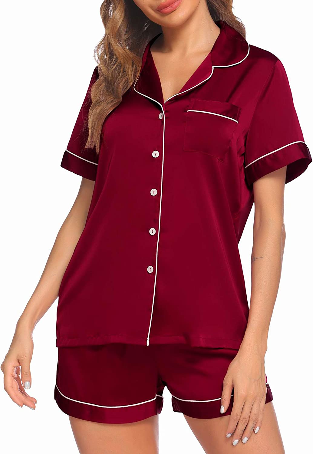 Pajama Top:Short sleeve sleepwear with notch collar,button front pajamas shirt and one chest pocket design.Lightweight and Skin-friendly silk pajamas for women.Great for sleeping,casual wear or lounging around the house or yard all day