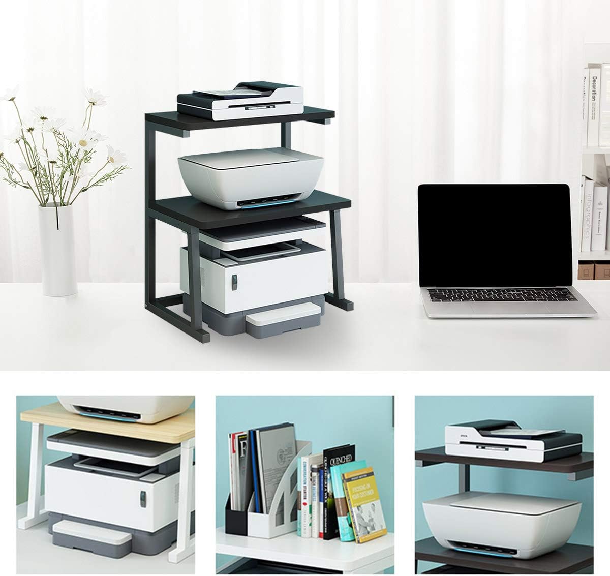 - 【3-TIER DESIGN】Our desktop printer stand comes with a 3-tier design. You can place the printer on the lower layer with more space, and place office supplies on the other two layers. The 3-tier design can save more space and provide a better storage effect.