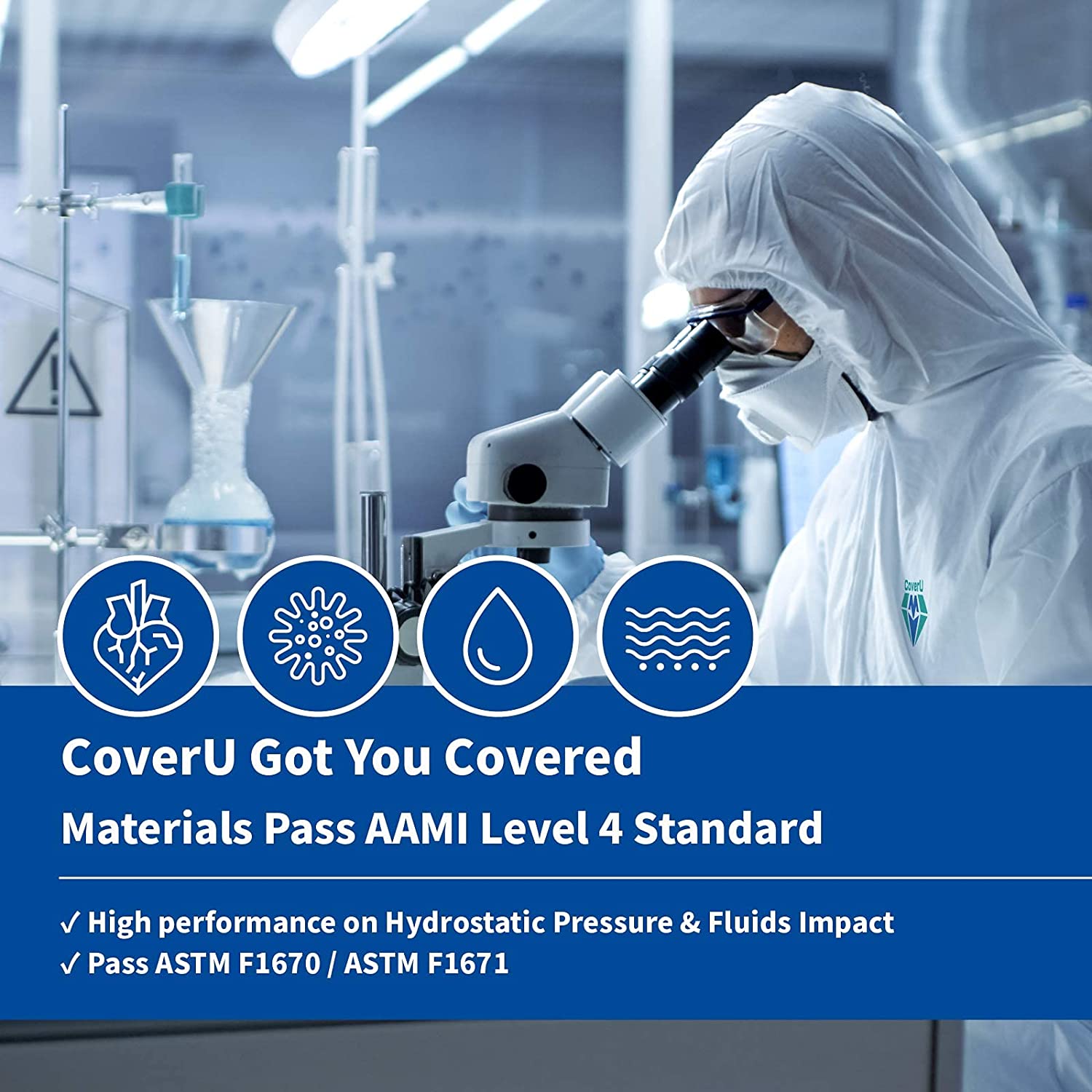 - 【Fabric Pass AAMI Level 4 Protection】High performance on AATCC 42 / AATCC 127 / ASTM F1670 / ASTM F1671 test. With the full coverage protection, this coverall creates a barrier to splashes, dust and dirt protecting you from contamination & hazardous elements.