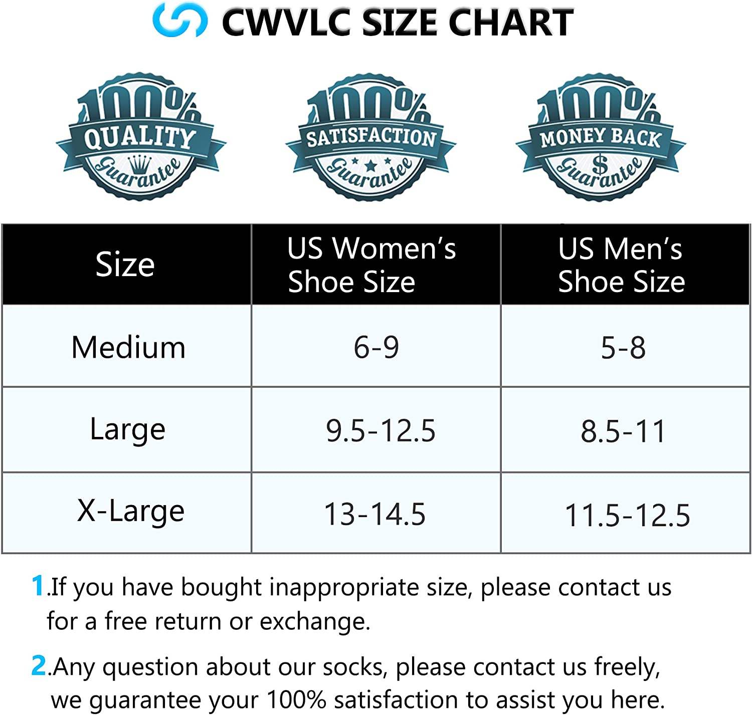 - 30+60 QUALITY GUARANTEE: If for any reason you are not fully satisfied with our quality, please contact Amazon.com and return it within 30 days for a hassle-free refund or replacement; if socks DEVELOPED A HOLE within 90 days of wearing, please be sure to contact CWVLC customer service with your order number, we will offer a reasonable and acceptable solution to make it up for you