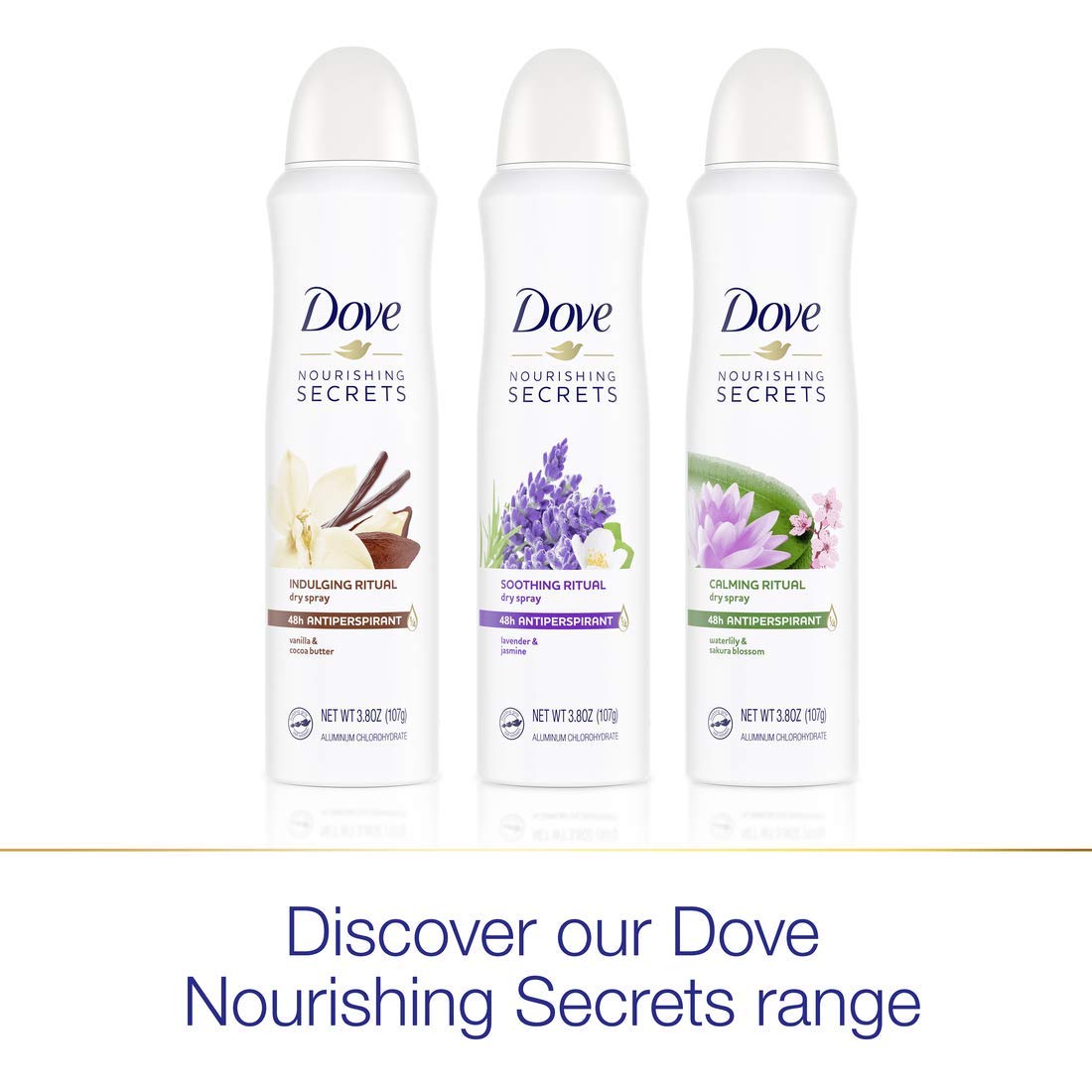 Who doesn't dream about a calm morning routine? Our calming ritual dry Spray Antiperspirant Deodorant waterlily & Sakura blossom is just the thing to keep you feeling calm, comfortable and confident first thing in the morning, without compromising on care and all-day protection. This Dove Nourishing secrets dry Spray Antiperspirant Deodorant for women will help you transform your daily self-care routines into luxurious rituals. Inspired by self-care rituals of real women, Made with 0% alcohol (ethanol) and enriched with Dove 1/4 moisturizers, this non-irritating antiperspirant formula leaves you with comfortable, beautifully soft underarms while keeping underarm sweat and odor at bay for up to 48 hours. But that's not all. This dry spray combines the sophisticated, sparkling scents of waterlily and Sakura blossom with comforting notes of sandalwood in a nature-inspired fragrance that's been created with responsibly sourced ingredients - so you can enjoy a calming ritual without compromising on care. It'll infuse your days with a small, but indulging ritual that's there for you and you alone, no matter what. For best results, Spray each underarm with two or three short bursts from about 6 inches away. Apply this Dove Antiperspirant Deodorant to dry skin after showering and enjoy fresh, comfortably dry skin from morning to night. This antiperspirant deodorant spray dries instantly, so you don't have to wait or worry.