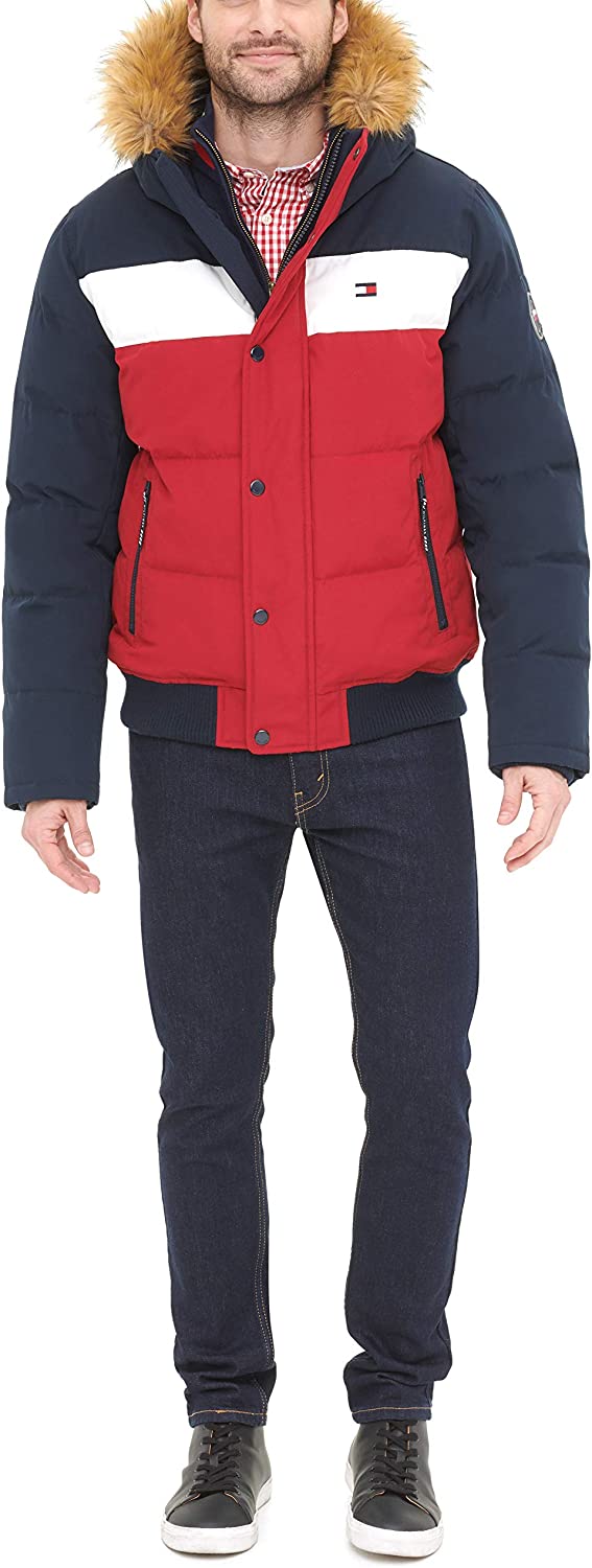 - Quilted snorkel bomber jacket in a wind and water resistant arctic cloth with a detachable faux fur trimmed hood