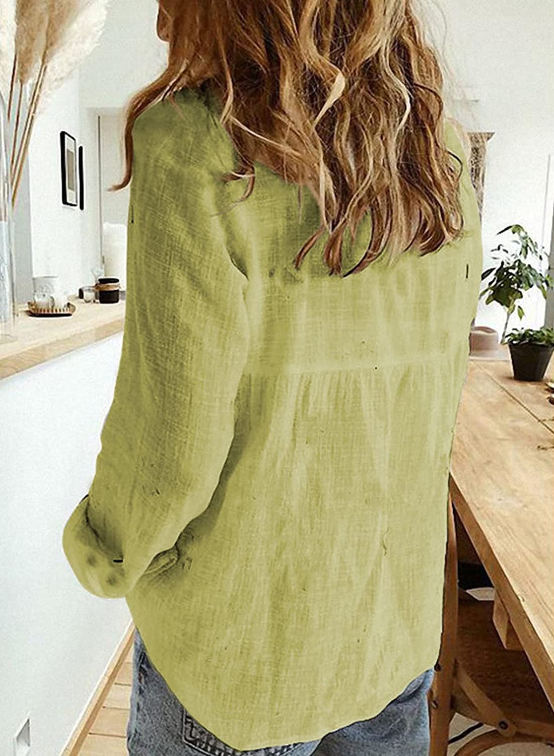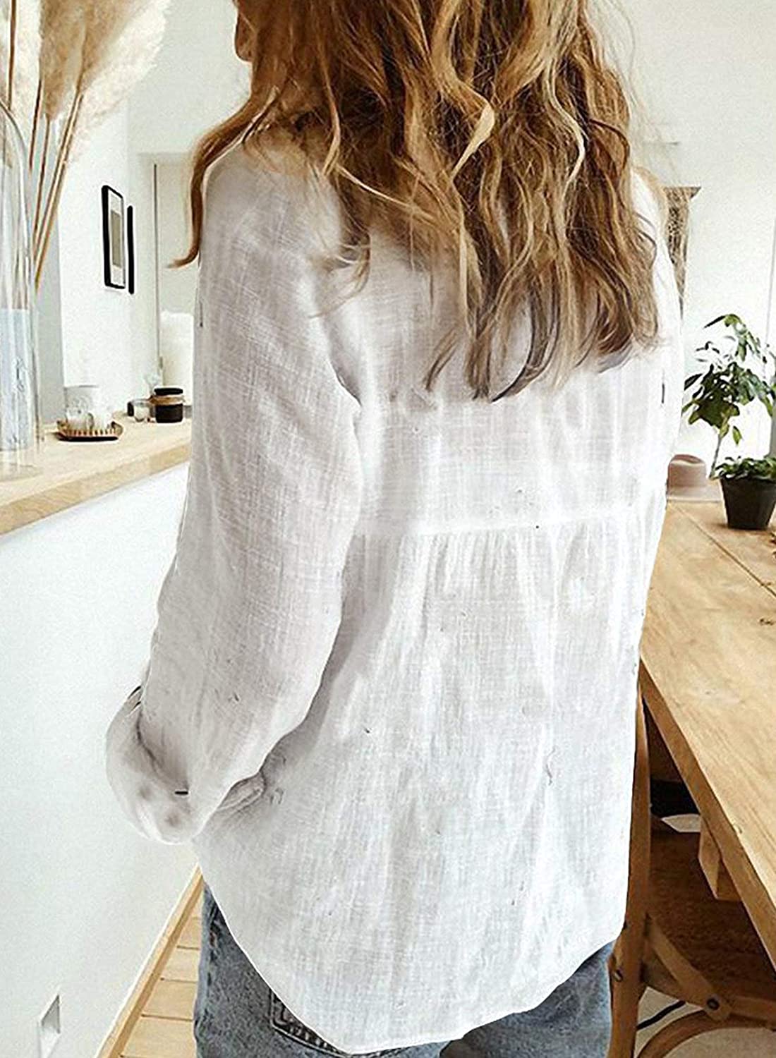 Features: Long Sleeve, Collared V Neck, Roll-up Sleeves, Button Down, Solid Color Design