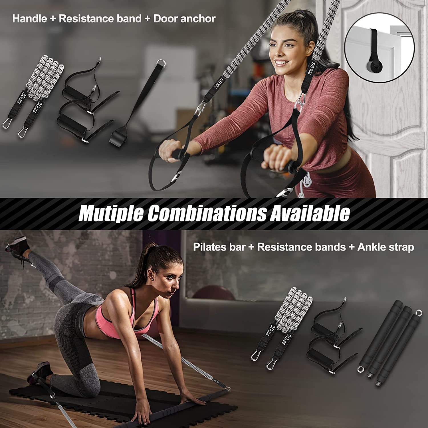 ✅『Customize Your Workout』WeluvFit Pilates Bands are length/resistance adjustable. Just 4 steps: Loose-Takeout-Adjust-Lock, then you can increase or decrease the bands' length/resistance for your strength training according to height,weight,fitness level,and age group. It comes with 4 length adjustable bands(2pcs strong, 2pcs standard, or 4pcs mixed-use), varying in resistance 20-40-60 pounds. Pilates bars are ideal home fitness equipment for men and women and the option burning calories faster.