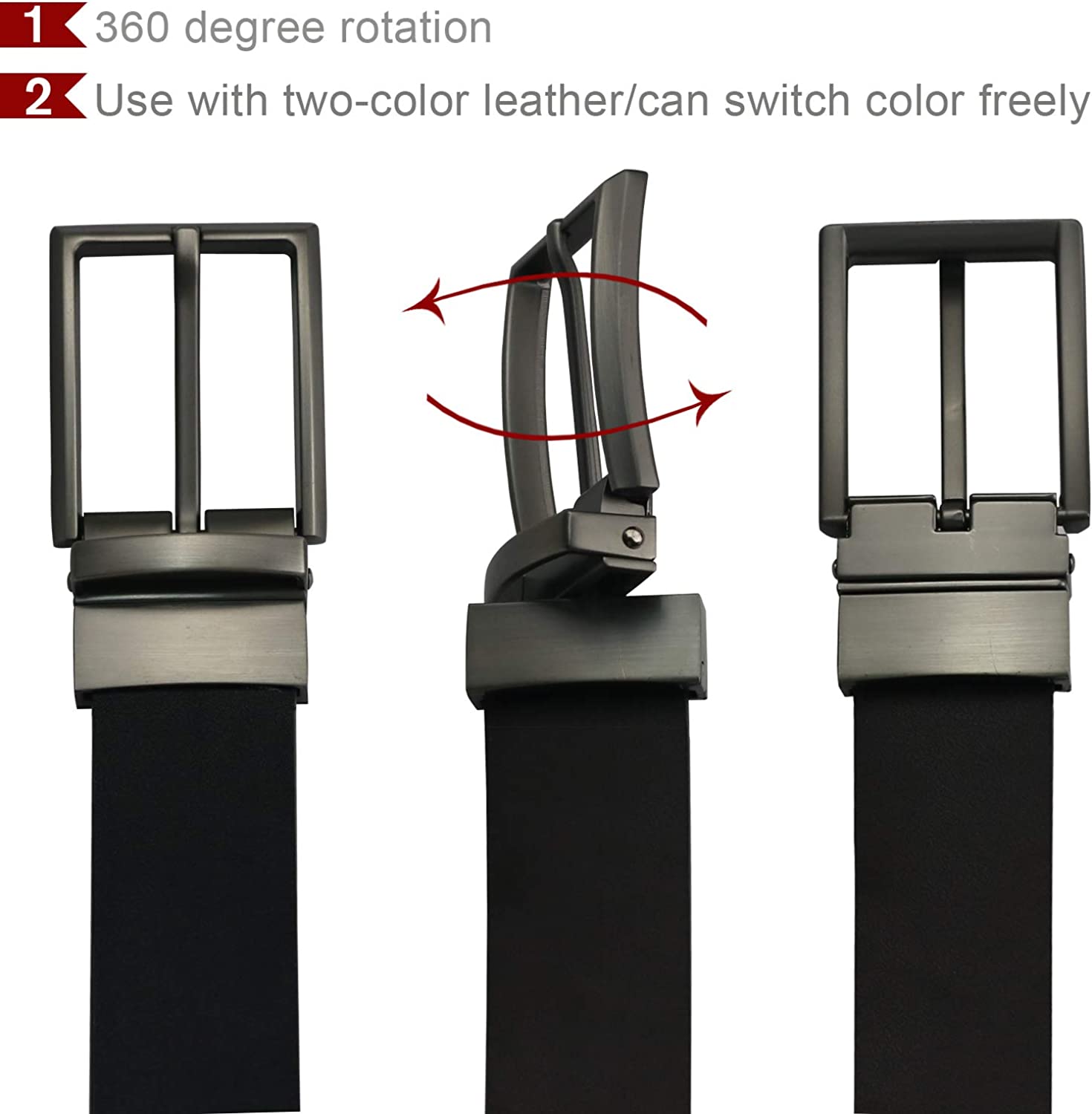 • Reversible Belt: Paying one belt but getting two colors to use! Stiff smooth leather with one side black and the other dark brown. Buckle can be rotated 360 degrees so two sides are available at your pleasure.