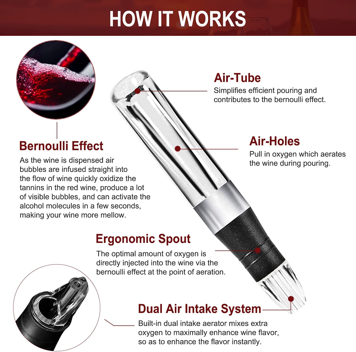 Aerate Your Wine to Perfection Quickly - Wine Aerator Pourer has a spacious space , built-in dual intake aerator mixes extra oxygen to maximally enhance wine flavor which uses the Bernoulli effect to ensure the most appropriate amount of oxygen is injected into the wine quickly.