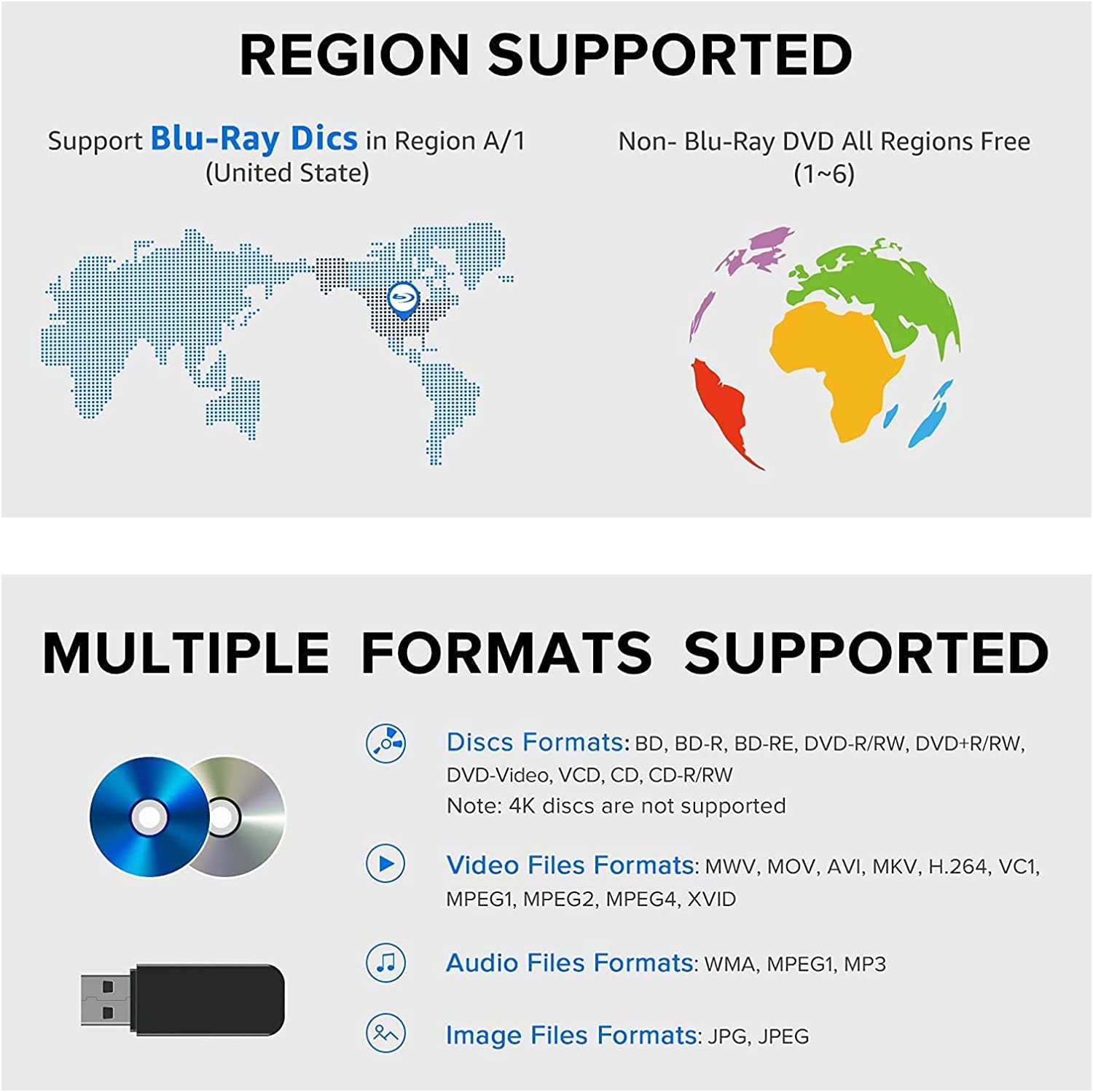 Play various DVDs formats includes BD, BD-R, BD-RE, CD, DVD, CD-R/RW, DVD-R/+R, DVD+RW/-RW, VCD, SVCD etc. Support Blu-Ray Disc in A/1 region, regular DVDs are all region free. Built in USB slot, support up to 32GB USB flash drive, you can play media files format contains WMV, MOV, AVI, MKV, XVID, MP3, JPG