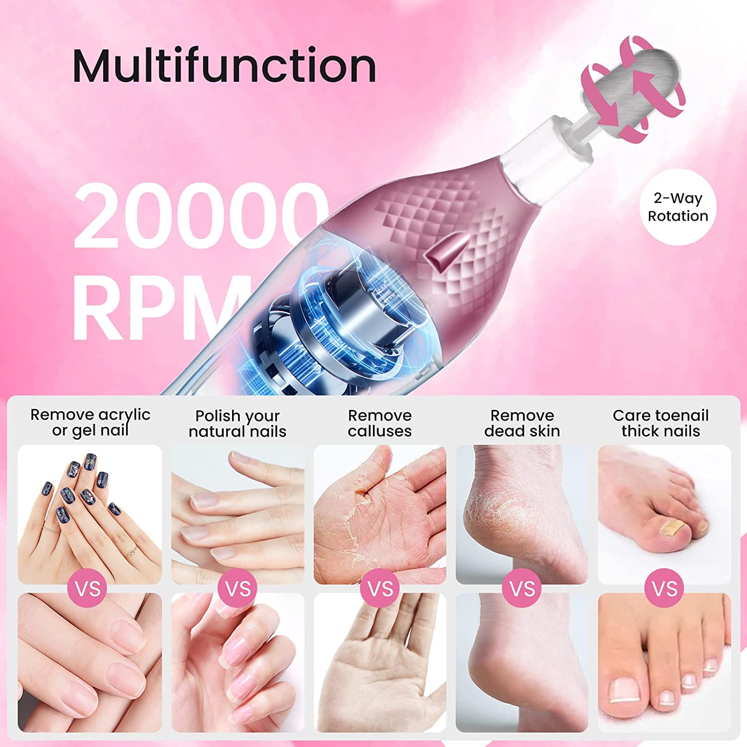 • ★【4 Speed Settings Up to 20000RPM】 Electric nail drill designed with four adjustable speeds and support Forward/ Reverse direction (Speed 1: 5000RPM ; Speed 2: 10000RPM ; Speed 3: 15000RPM ; Speed 4: 20000RPM), which makes this electric nail file easier to polish your nails. Powerful enough for giving you a great precise nail grinding effect and flawless salon nails meanwhile there is no need to worry about hurting your nails.