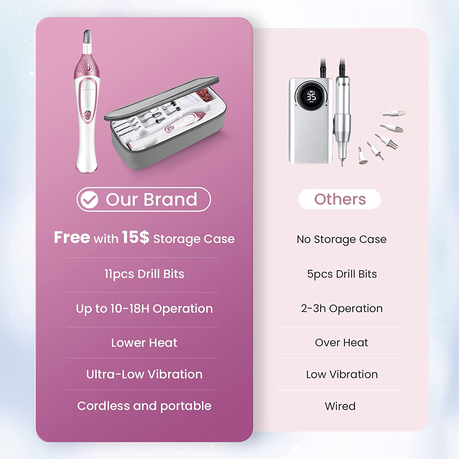 • ★【Rechargeable, Cordless and Use up to 10-18 hours】New Version nail drill machine- the built-in lithium battery delivers up to 10 -18 hours of cordless use when fully charged. The LED light provides a highlighted view during use, achieving a precise manicure and pedicure. Have salon-quality manicures and pedicures at anytime anywhere.
