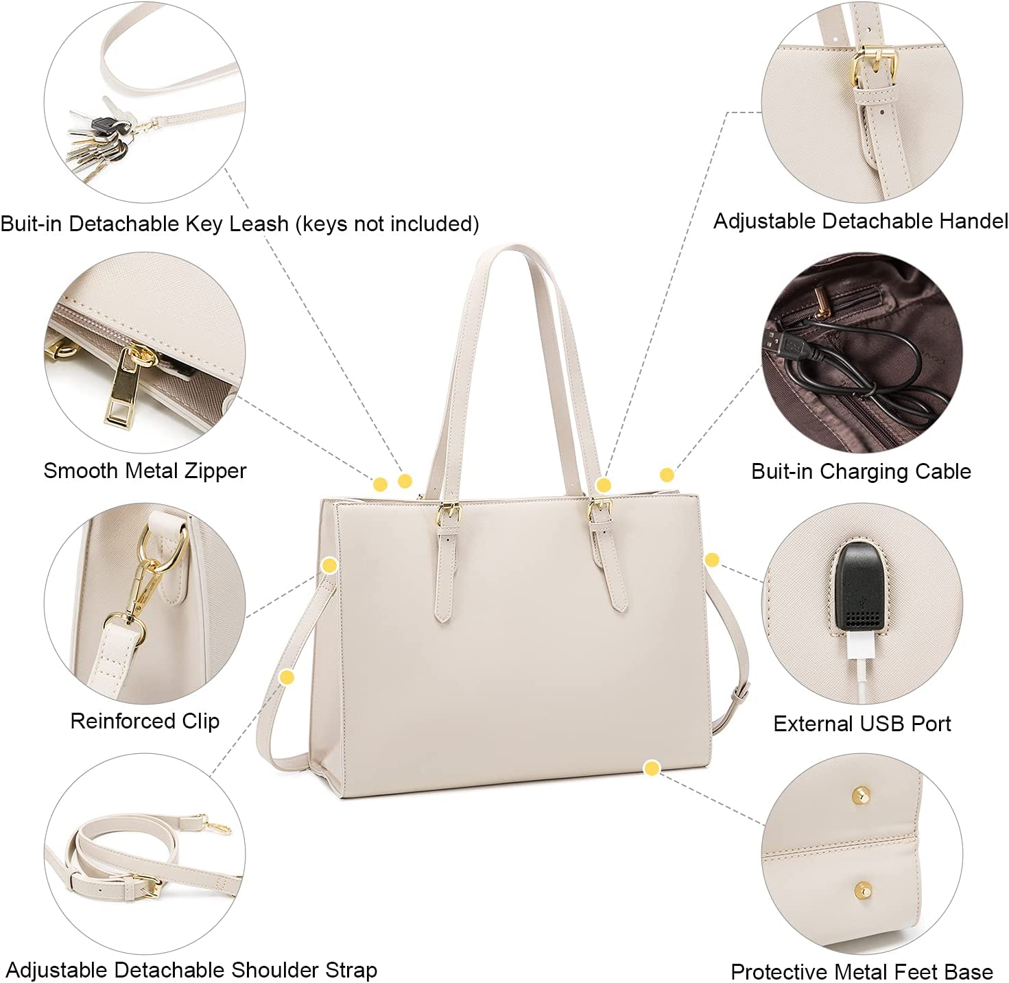 【Multi-pocket Design】Multiple pockets keep your belongings organized. The handbag structure consists of a 15.6-inch laptop pocket, an iPad pocket, a middle zipper pocket, an internal side zipper pocket, two large opening compartments, two small opening pockets, two pen pockets and an outer zipper pocket. And an external USB charging mouth.