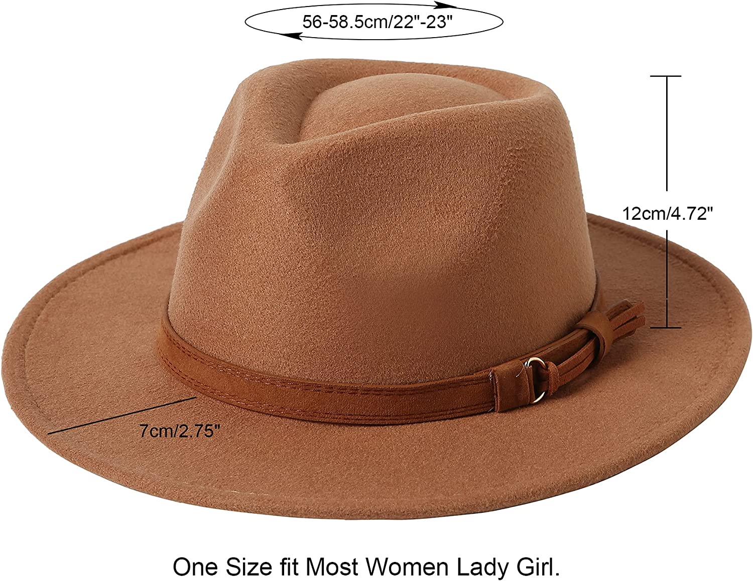 Size:One size fit all most women. Hat circumference 22.6'',fit 22"-22.8" 7 1/8-7 1/4 size; Brim 2.9" 。