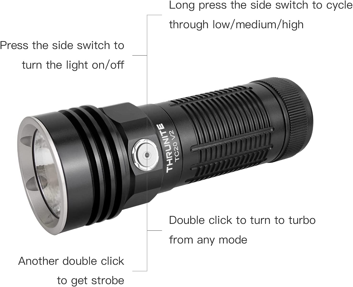 Change ModesWhen the light is on, long-press the side switch to cycle through low, medium and high.Shortcut to firefly: When the light is off, long-press the side switch to get firefly mode.Double click to turn to turbo from any mode. Another double click to get strobe.