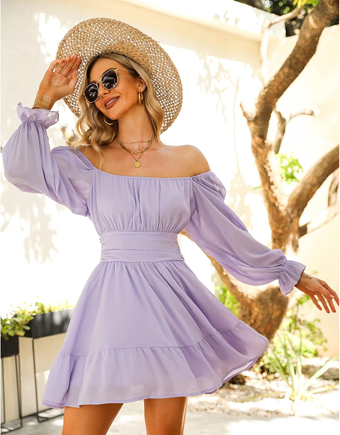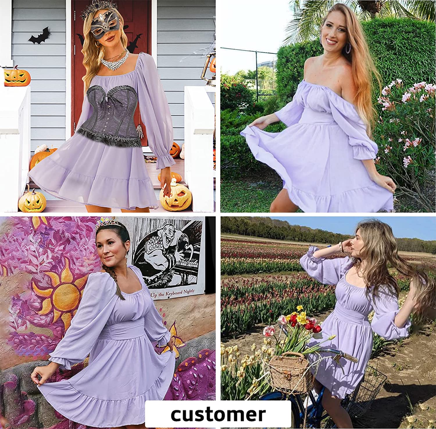EXLURA Women Tie Back Wedding Guest Dresses Long Lantern Sleeve Square Neck Ruffle Elastic Waist Aline Casual Mini Dress