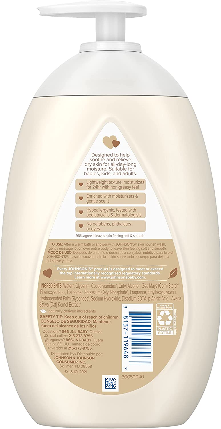About this item            16.9-fluid ounces of Johnson's Skin Nourish Moisturizing Baby Body Lotion with vanilla and oat scents and moisturizers to soothe and relieve dry skin for all-day-long moisture   This daily lotion moisturizes for 24 hours and offers a non-greasy feel, with 96% agreeing it leaves skin feeling soft and smooth  Enriched with moisturizers and a gentle vanilla and oat scents, this skin nourishing lotion is suitable for babies, kids and adults too  With clinically proven mildness, the hypoallergenic lotion is tested with pediatricians and dermatologists and contains no parabens, phthalates or dyes  This baby lotion for dry skin is a great addition to a regular skincare routine. After a warm bath or shower with Johnson's Skin Nourish Wash, gently massage lotion over entire body to leave skin feeling soft and smooth