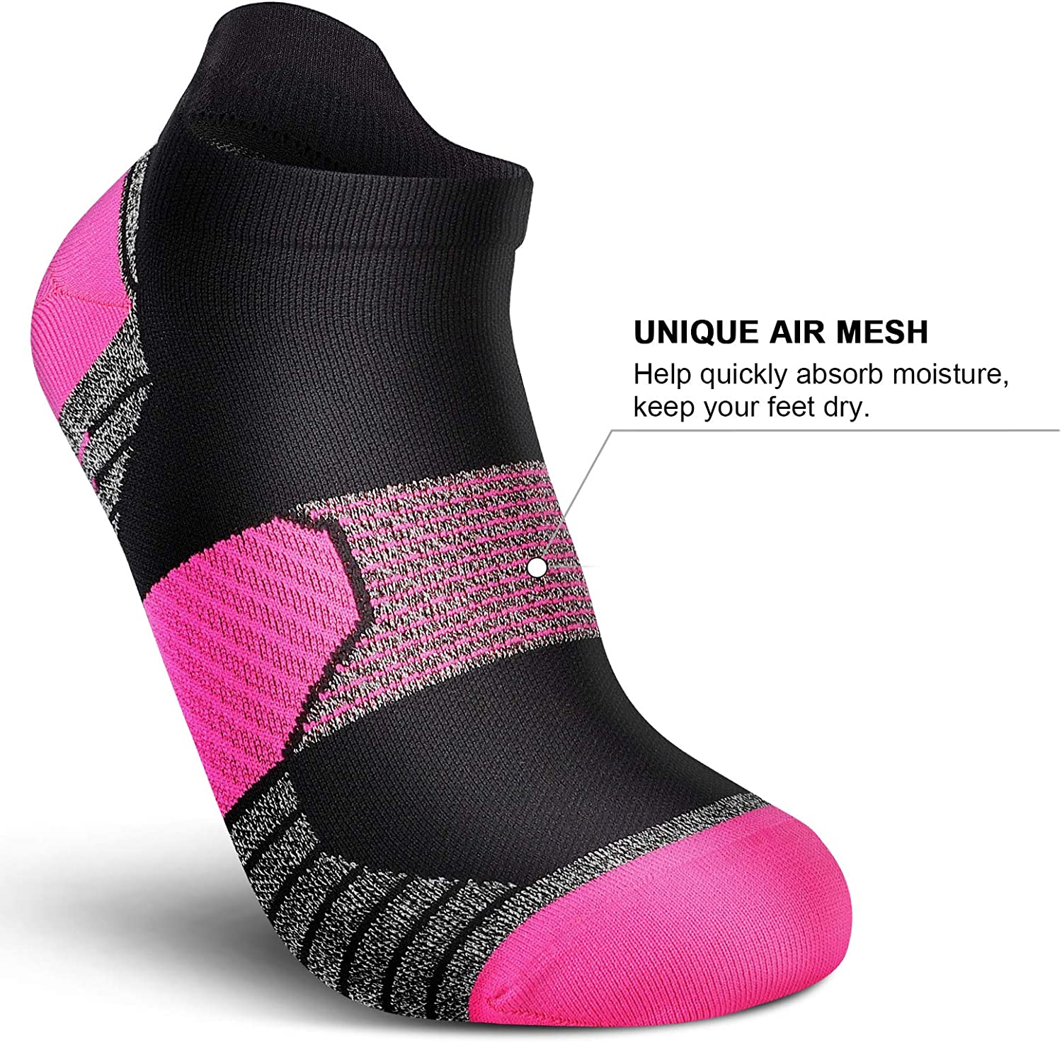 [MESH DESIGN & BREATHABLE] These compression ankle socks for women are made of high-quality material, which can quickly absorb moisture and release sweat. Mesh ventilation in the arch reduces heat and increases perspiration, good moisture-wicking performance to help your feet keep cool and breathable all-day long