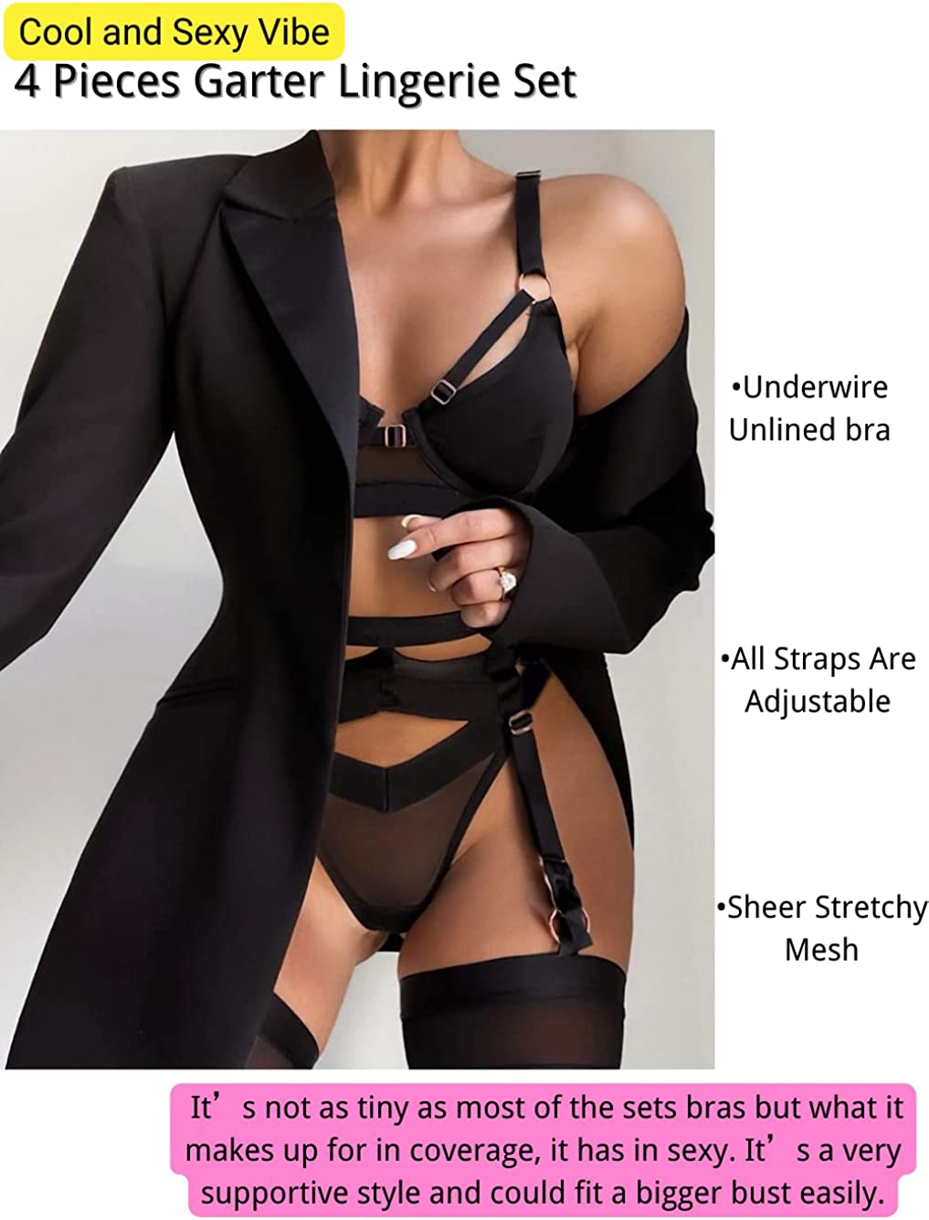 ✿Feature: This matching bra and panty set with belt and thigh bands is featured with strappy, high leg, metal ring, sheer mesh which shows your curve beautifully.