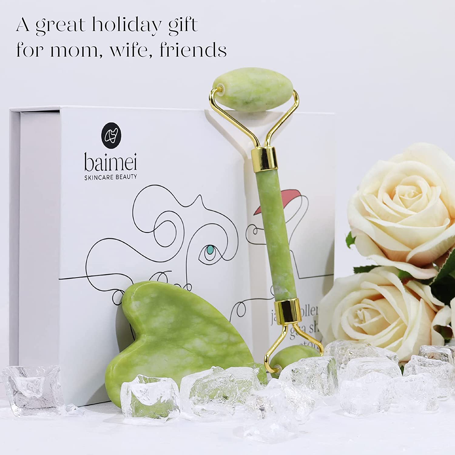 BAIMEI Jade Roller & Gua Sha Set Face Roller and Gua Sha Facial Tools for Skin Care Routine and Puffiness-Green