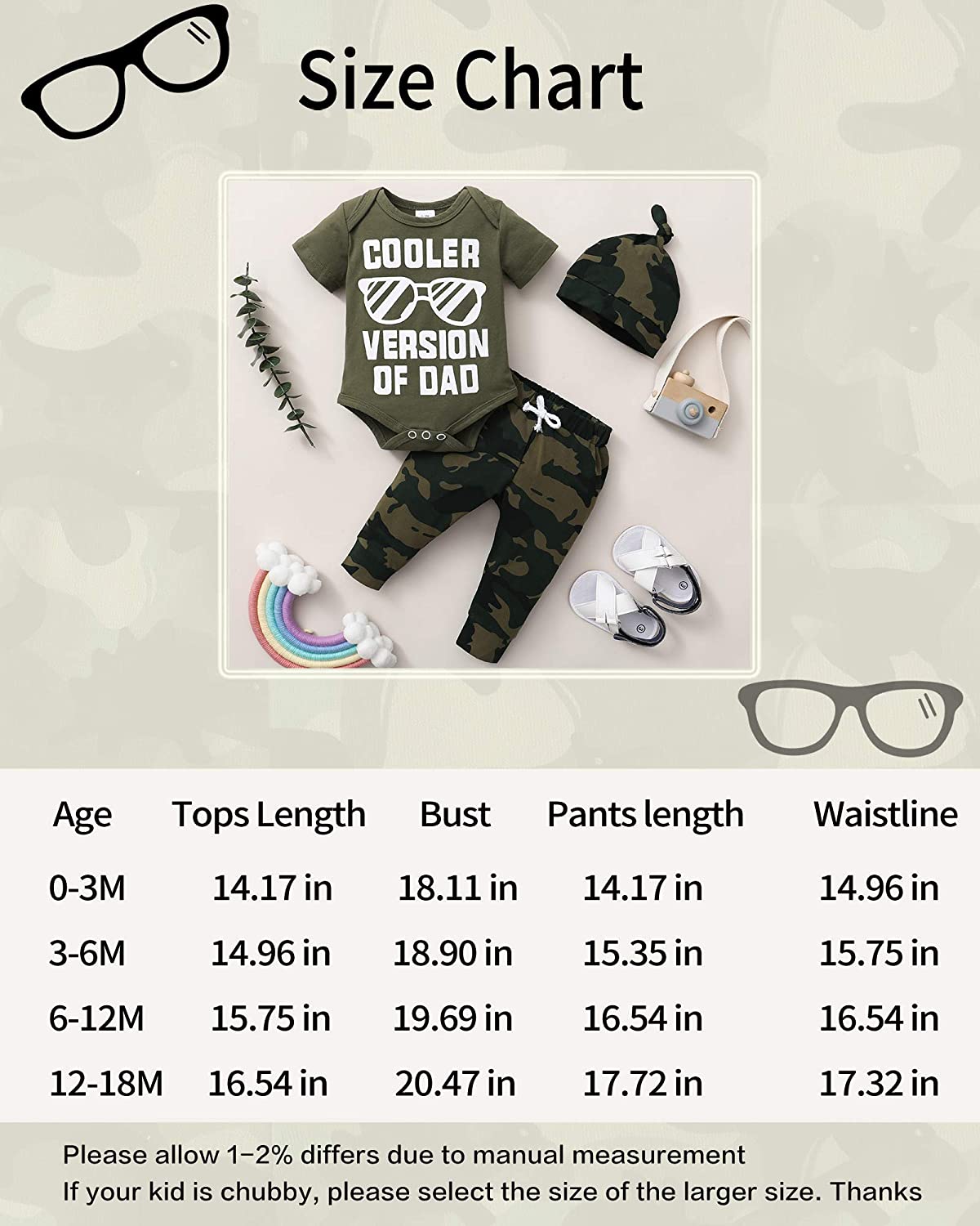 • √ Unique design of Baby Boy Outfit–Baby boy romper top with botton opening for easy wear . "COOLER VERSION OF DAD" printed stylish bring impressive and eye-catching feelings . Elastic waistband camo long pants make for easy dressing and bring convenience for movement.It also has a hat for your boy . Your boy will be the handsome one.