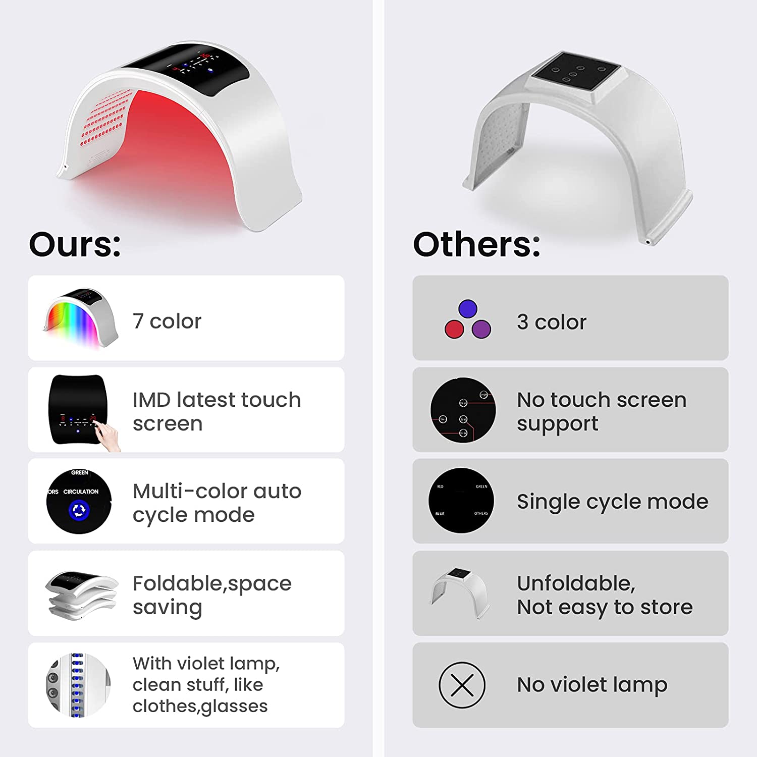 【8 in 1 LED Light Therapy】: Red Light - For acne and repair skin; Blue Light - Calms and tightens skin; Green Light - Lightens scars and oil control; Yellow Light - Reduces redness and Freckle; Purple Light - Whitening and brightening; Cyanine Light - Soothing and wrinkles; White Light - Fine and smooth skin. Violet Light - Self-cleaning of the device.