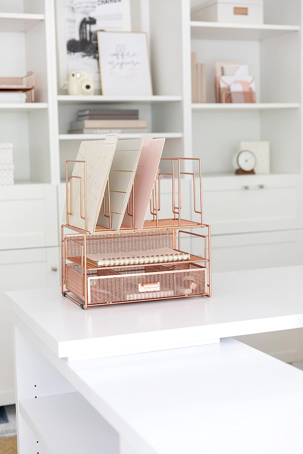 - MODERN, SPACE SAVING DESIGN: Organization does not have to be difficult. Made of metal finished in rose gold and featuring a unique mesh design, this Vertical and Horizontal File and supplies organizer with drawer and letter sorter keeps things organized and saves space.
