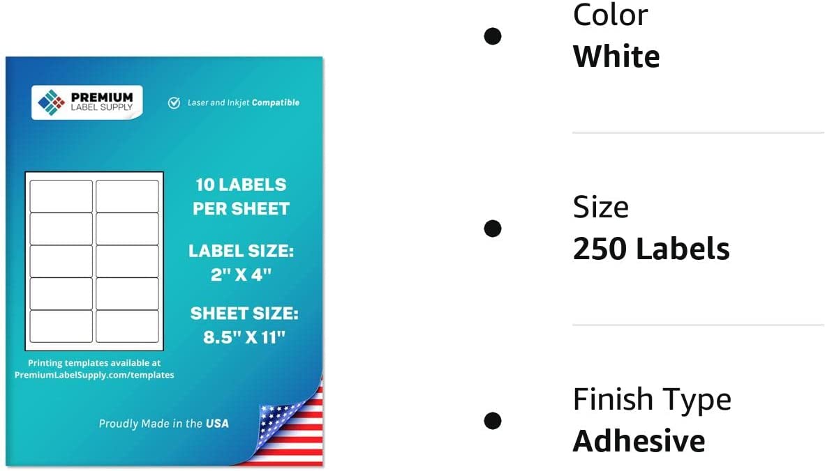 Premium Label Supply White Sticker Address Labels – 2” x 4" – Laser/Inkjet Compatible – (10 Labels/Sheet), 25 Sheets – 250 Total Adhesive Labels