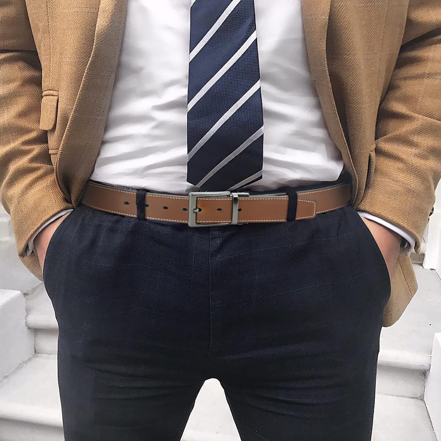 2-IN-1 VERSATILE STYLE - Pay for one but get two colors in one leather belt. The Classic design of the men’s belt is perfect to be paired with your favorite jeans, casual or dress pants. PERFECT FIT - Changing the design of the traditional double side, No-More-Screwdriver-Tools, you can easily trim to your exact size, especially for you with 33/35 waist.