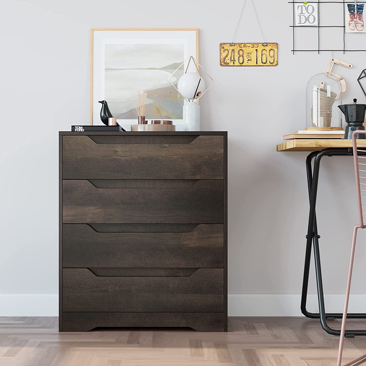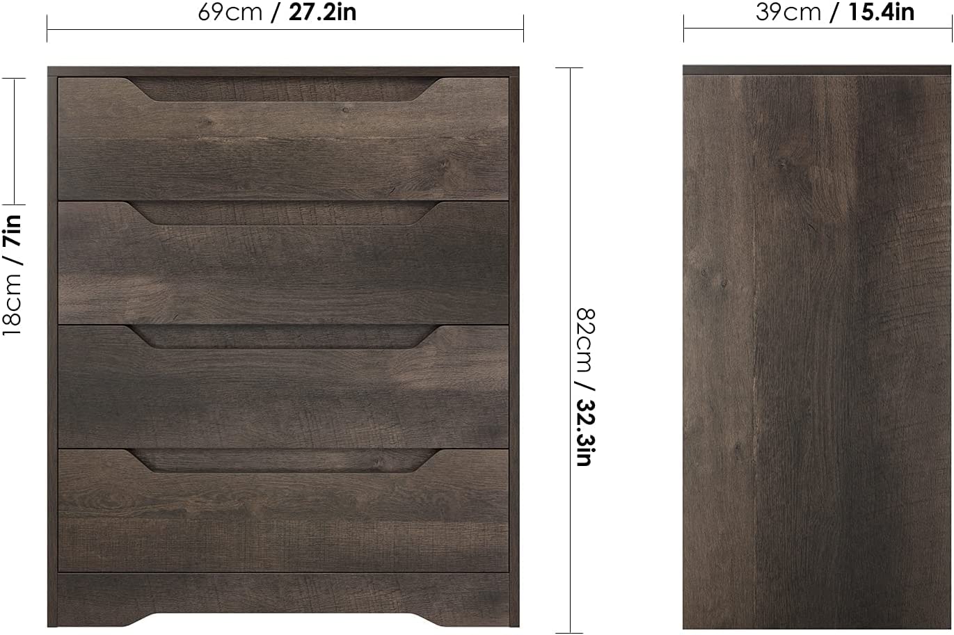 URKNO Modern 4 Drawer Dresser, Wood Chest of Drawers with Storage, Clothing Organizer with Cut-Out Handle, Storage Cabinet, Nightstand for Living Room, Bedroom, Hallway, Dark Brown