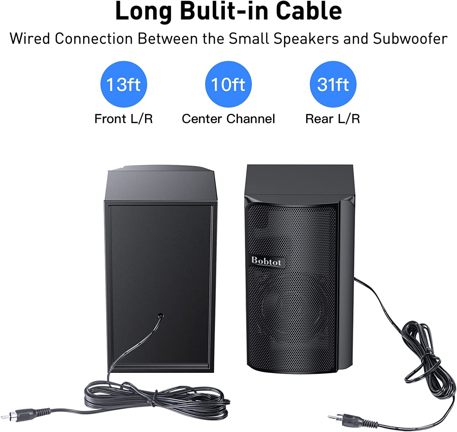 5.0 Bluetooth Connection & Wired Connection: Wired connection between the small speakers and the subwoofer(not wireless), with long built-in cable, the speakers can be placed anywhere: Front Speakers L/F: 13Ft, Rear Speakers L/R: 31Ft, Center Speaker: 10Ft. 5.0 Bluetooth technology supports you to directly connect with Bluetooth devices