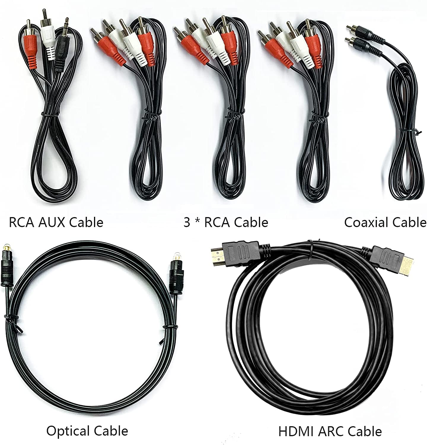 Multimedia Support: Surround sound speakers can connect to various smart devices, and support multiple input modes like TV ARC/OPT/COA/AUX/USB/BT/DVD. Additional cables include HDMI cable/Optical cable/Coaxial cable/AUX cable/RCA Cable/Antenna cable that can support any application in need