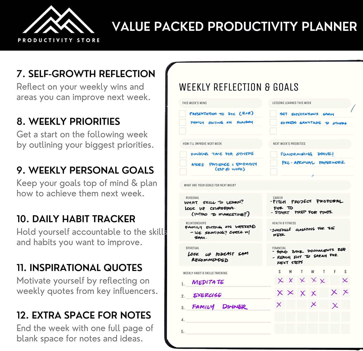 ✅ WEEKLY PLANNER WITH BONUS FEATURES: Plan ahead each week by establishing your weekly goals and reflect on your performance each week. Comes with 5 Bonus features including a detailed habit tracker, weekly inspirational quotes, a daily productivity score and a budget planner.