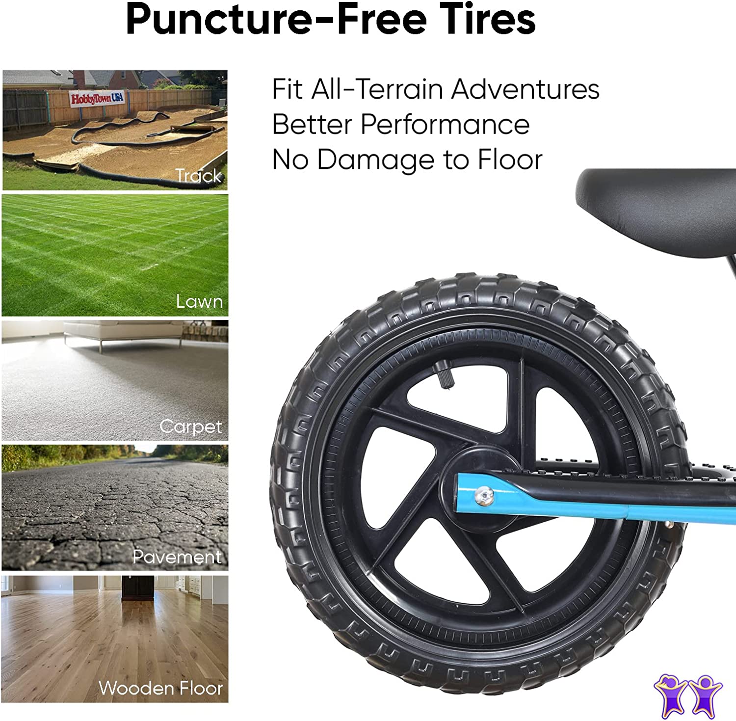 • EXTRA-THICK ALL-TERRAIN TIRES – We want kids to feel strong and stable when they’re moving on grass and sidewalks which is why we added puncture-resistant tires to the front and back of each balance bike for 4-year old’s and 18-month-old riders.