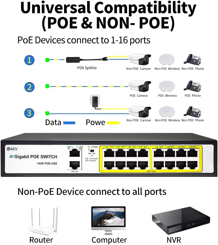 【VLAN mode 】VLAN mode(Turn on the AI switch) support isolate 16 PoE+ port from each other. It is easy for this 16 port PoE switch to manage and maintain, Prevent broadcast storms, Prevent data confusion, Wireless networking application data is more stable.