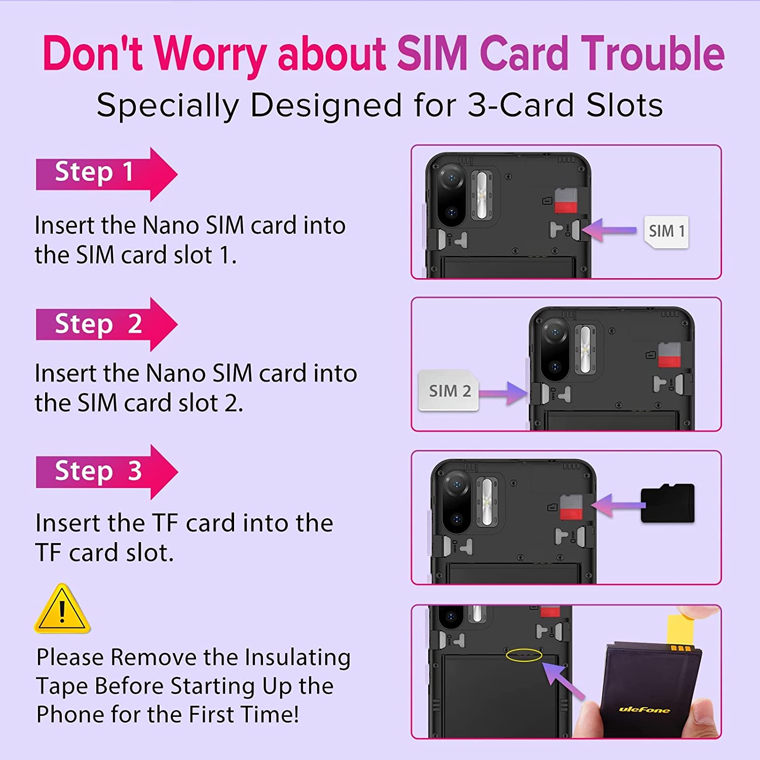 ? 3 independent card slots for 1* Nano SIM, 1* Nano SIM, 1* TF card(up to 128GB). ❤️Note: Please remove the insulating tape before starting up the phone for the first time!