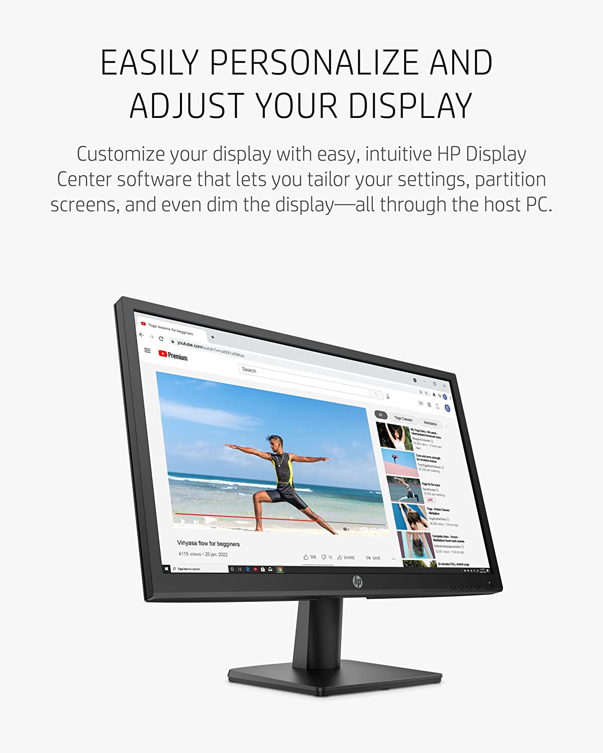Browse the web, stream your shows, and get work done on the everyday HP V223ve FHD Monitor. This HP computer monitor’s 21.5-inch Full HD screen boasts unparalleled visuals every time you turn it on (1). What’s more is that the 1080p monitor features a 75Hz refresh rate for smoother images, plus a superb contrast ratio for better color differentiation (2). No matter where you view your HP monitor, the VA panel ensures image clarity is maintained across ultra-wide 178-degree horizontal and vertical viewing angles. Easily connect a laptop, an external storage drive, or an additional monitor with the HDMI and VGA ports. Get the most out of a PC monitor designed for both comfort and efficiency. The TÜV certified Low Blue Light Mode limits the strain put on your eyes, while the tilt-adjustable display ensures comfortable posture all day. Beyond this HDMI monitor’s comfort settings, the narrow bezel design keeps things stylish and productive, letting you see more of your favorite show or word document. Customize your display with ease thanks to the intuitive HP Display Center software; through the host PC, you can personalize every little detail from display settings, screen partitioning, and even dimming the screen. Further customize the way you use this monitor with standard 100 x 100 millimeters VESA mounting options (3). This 75Hz monitor’s energy-efficient design isn't just for you but the environment too, as your device reduces power consumption and energy costs. Plus, the materials used in the packaging are 100% sustainably sourced and recyclable (4). Rest easy as your monitor is covered by an HP 1-year limited hardware warranty. (1) Full high-definition (FHD) content is required to view FHD images. (2) During video playback only, depending on series of frames or time duration. (3) Bracket not included. (4) 100% outer box/corrugate cushion packaging made from sustainably sourced certified and recycled fibers. Fiber cushions are made from 100% recycled wood fiber and organic material. Excludes plastic bags and plastic foam sheeting. 06/04/2021_r1 tg.