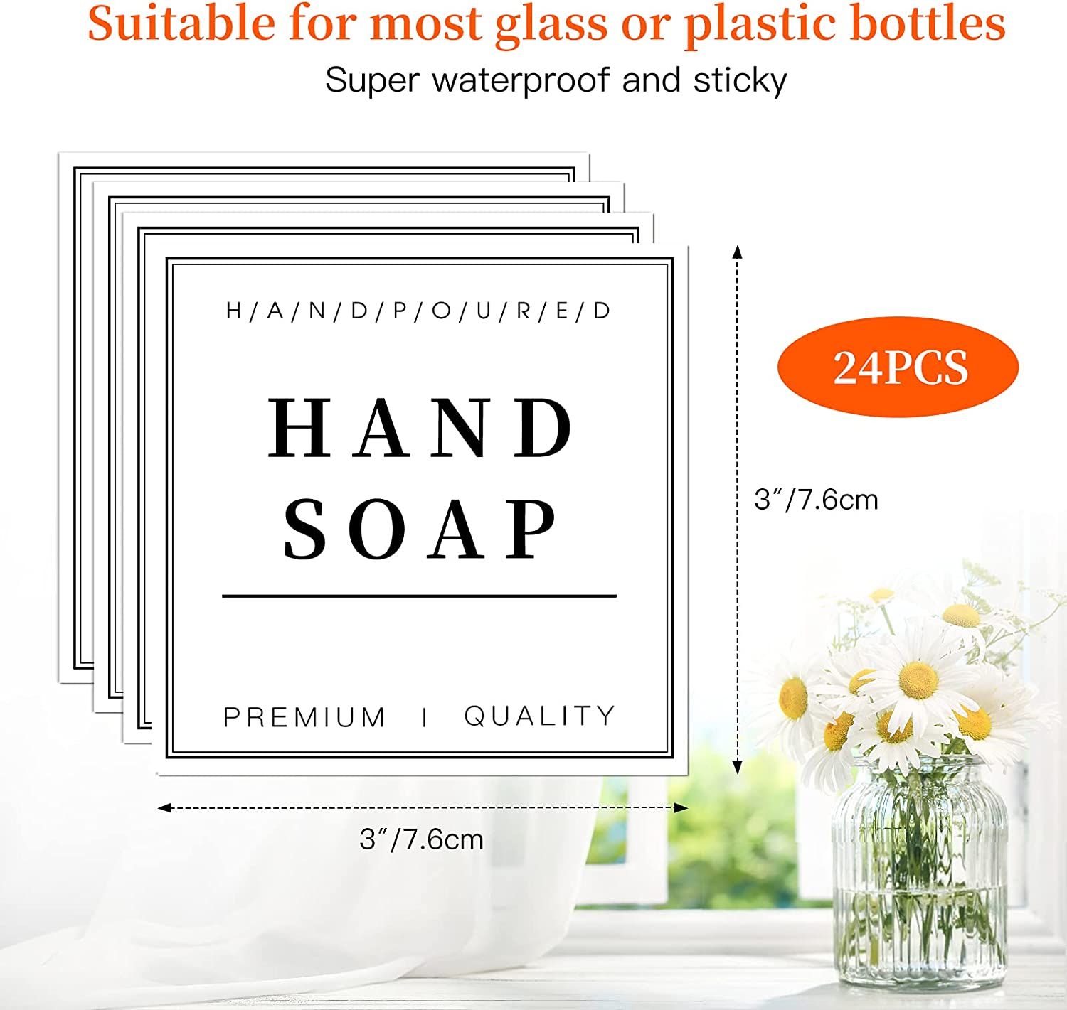 • 5.[Reusable and easy to clean]---The soap label stickers can be easily pasted on smooth surfaces, such as glass bottles, plastic bottles, shampoo and conditioner bottles,etc. The corners will not be curled and will not fall off easily. The self-adhesive label can be easily torn off and re-attached for use.