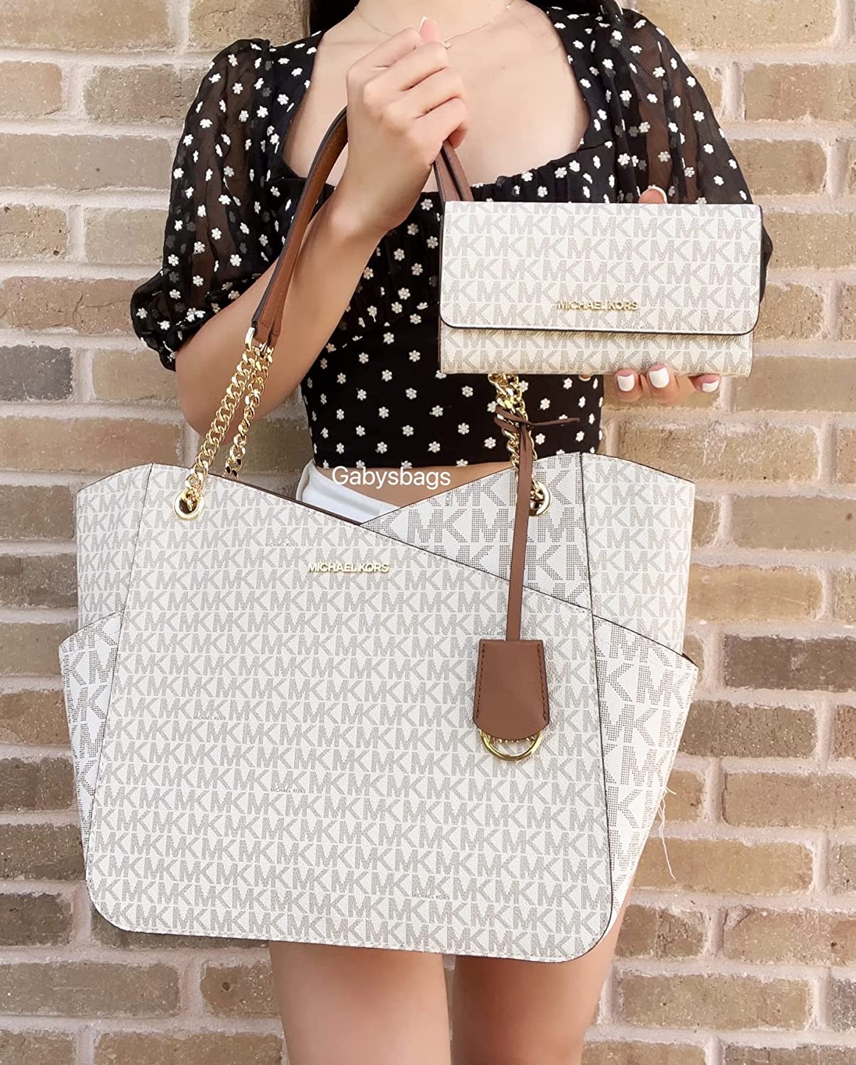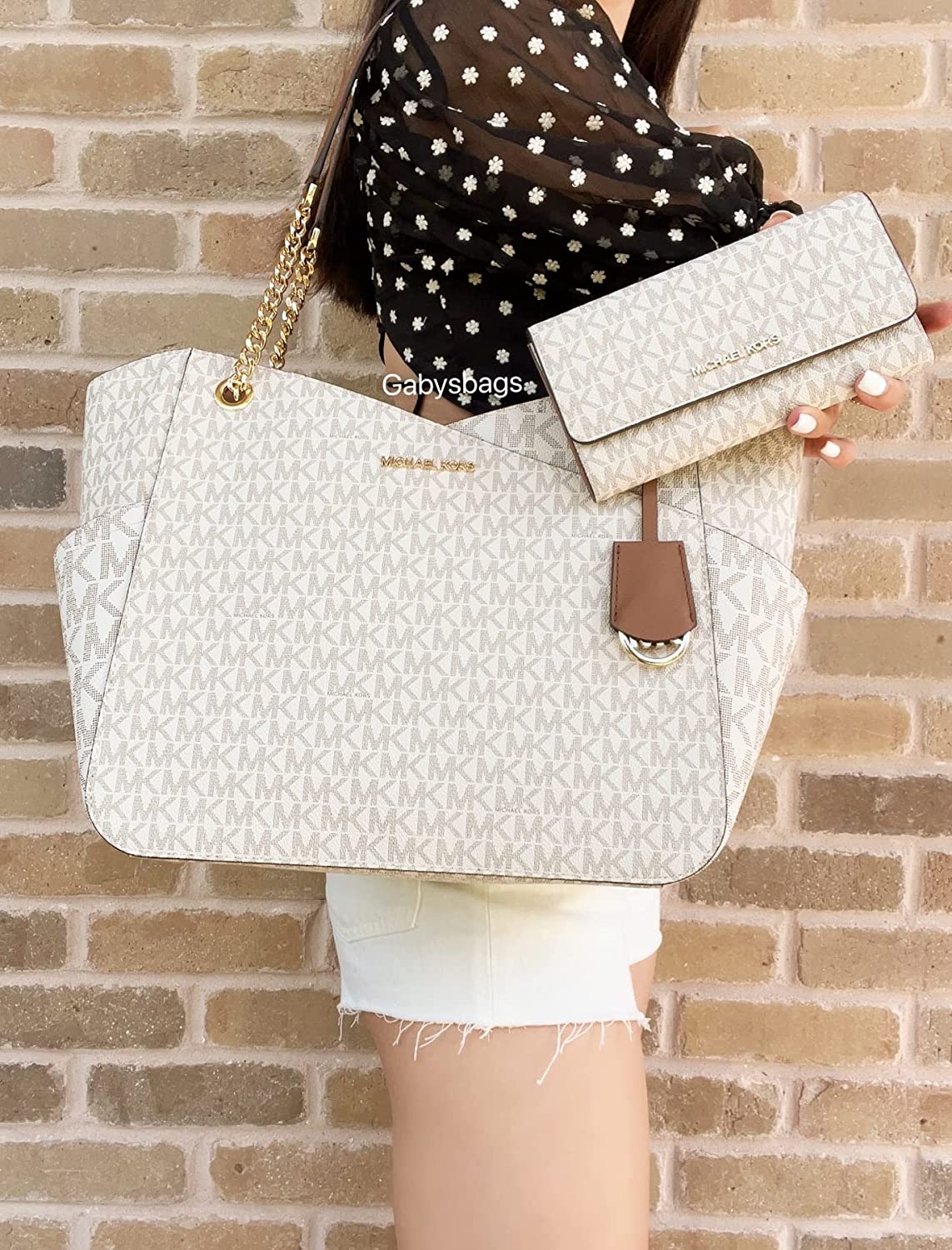 Bundle of 2 items: MICHAEL Michael Kors Jet Set Travel Large Chain Shoulder Tote bundled with Michael Kors Jet Set Travel Trifold Wallet Double top handles with chain detail in gold, Three quarter zippered top closure with side gusset pockets Exterior details: front slip pocket Interior details: back zip pocket, 2 back slip pockets; Top Zip; Signature lining, front logo and gold hardware; Wallet has 17 credit card slots, several full length bill slots, zipped compartment in back, and ID window.; Bag Measures Approximately: 15.6”W X 11”H X 5.5”D Handle drop: 10". Wallet Size: 7.5"X4"X1"