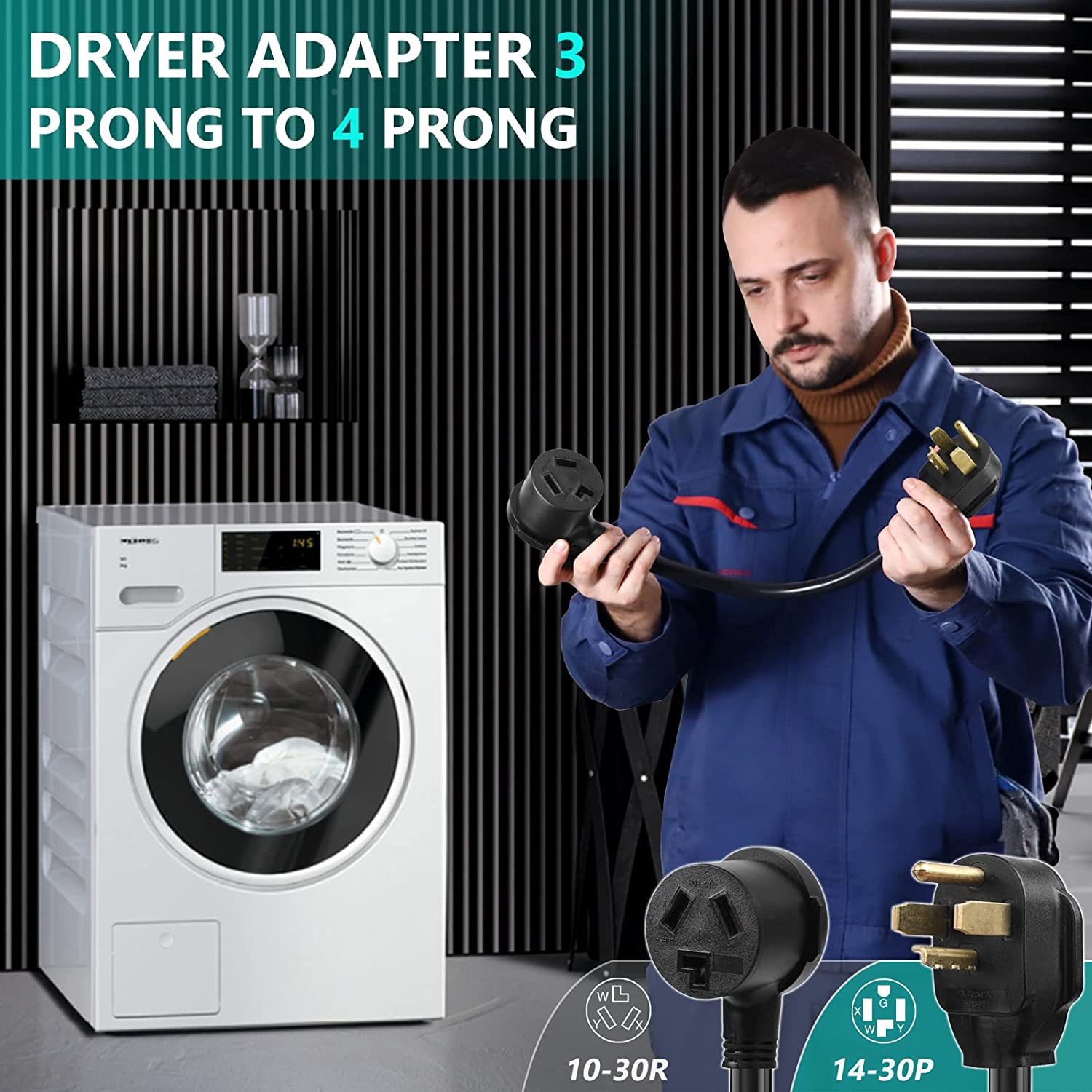 - 【Adapter for 240-Volt Electric Clothes Dryers】 30AMP (14-30P) male plug to 30AMP (10-30R) female outlet.Converts 3 prong dryer to fit a 4 slot wall dryer outlet when you moving into a new home, house or apartment.