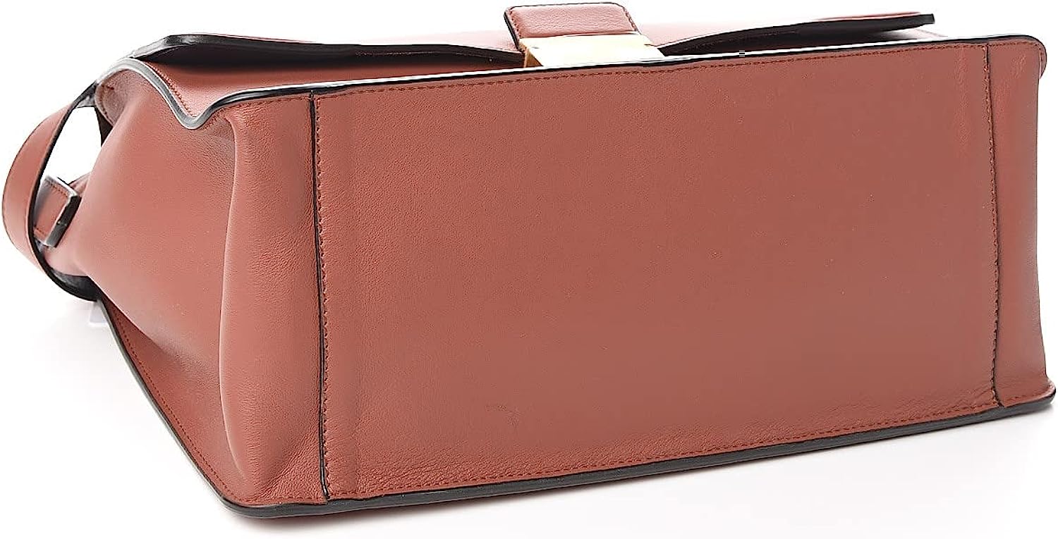Color: Rust Brown. Calfskin Leather. Gold-tone hardware. Push-lock closure. Interior brown suede and navy blue calfskin leather lining. One interior slip pocket with snap closure