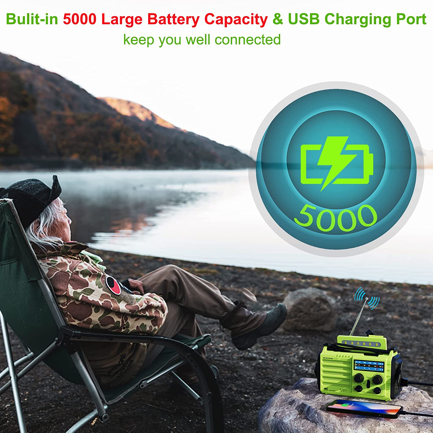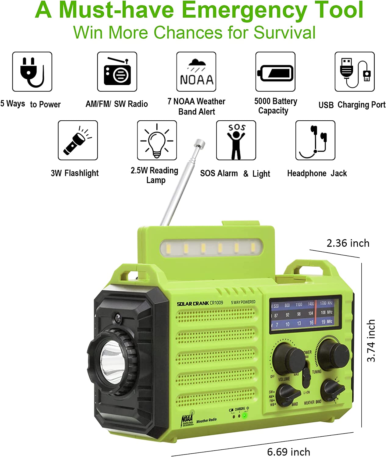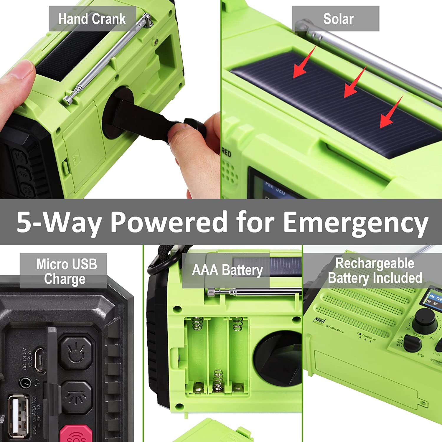 • 【5-Way Power Sources】This emergency solar ???? ????? ????? with multiple power backup options is the best value for survival radio in this market. 5 power sources - 5000 Large Capacity Built-in rechargeable battery, solar, crank, 5V USB Input, 3*aaa battery. No matter what emergency you’re in, it never runs out of electricity!