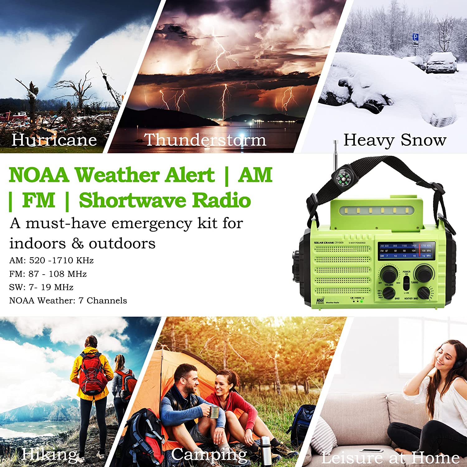1> Emergency Radio with AM FM Shortwave Radio & NOAA Severe Weather Broadcasts - suitable for emergency preparedness applications, home everyday use, or outdoor activities such as camping, backpacking, hiking, traveling, picnic and climbing.