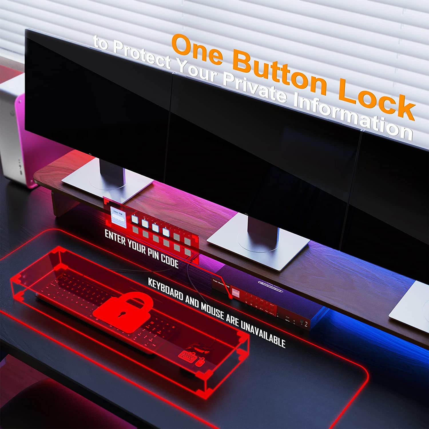 • 【Protect Your Private Information】 Just press the lock button to lock the KVM and protect your private information when you temporarily leave your desk. After locking, all displays will be off, audio output will be paused, and LCD screen brightness will be reduced to a minimum, all buttons will be invalid. You can enter the password to unlock when you come back.