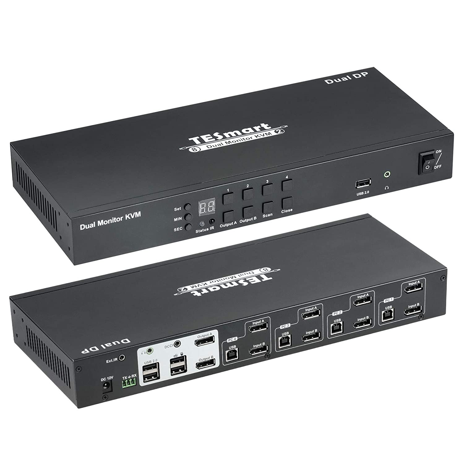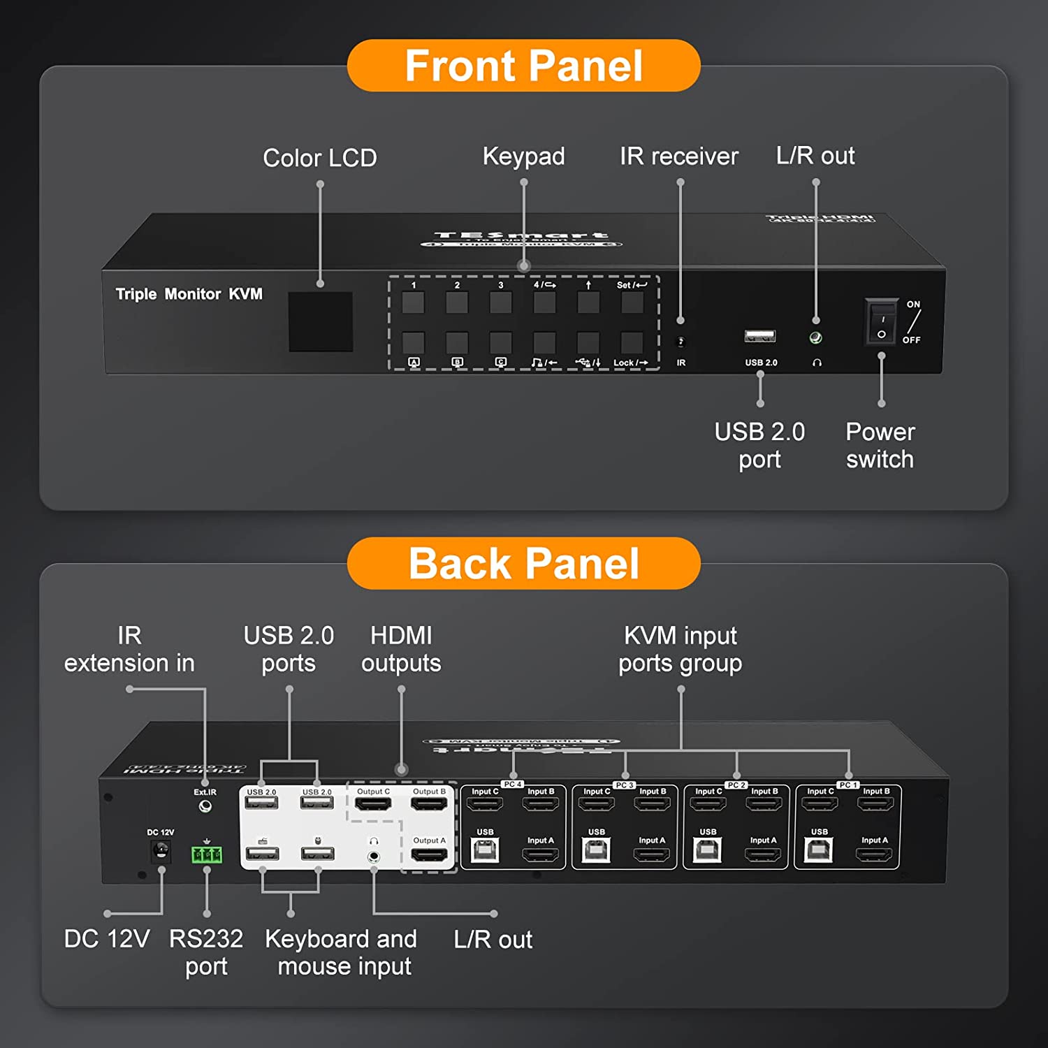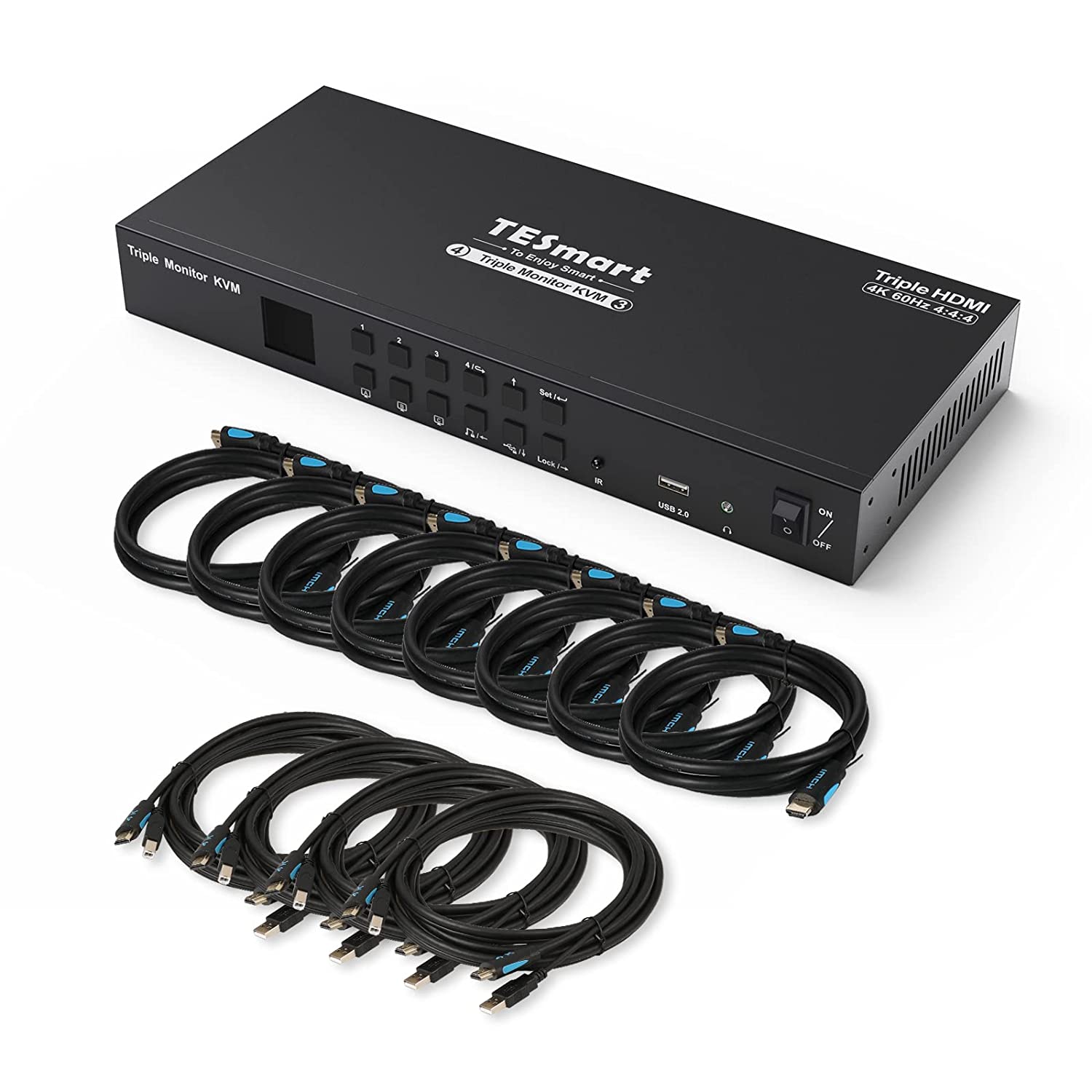TESmart KVM Switch 3 Monitors 4 Computers 4K@60Hz 4:4:4, Support 3 USB Peripherals, 2 Audio Out, Mechanical, Multimedia Keyboards, RS232, Triple Monitor HDMI KVM Switches 4 Port Box with KVM Cables