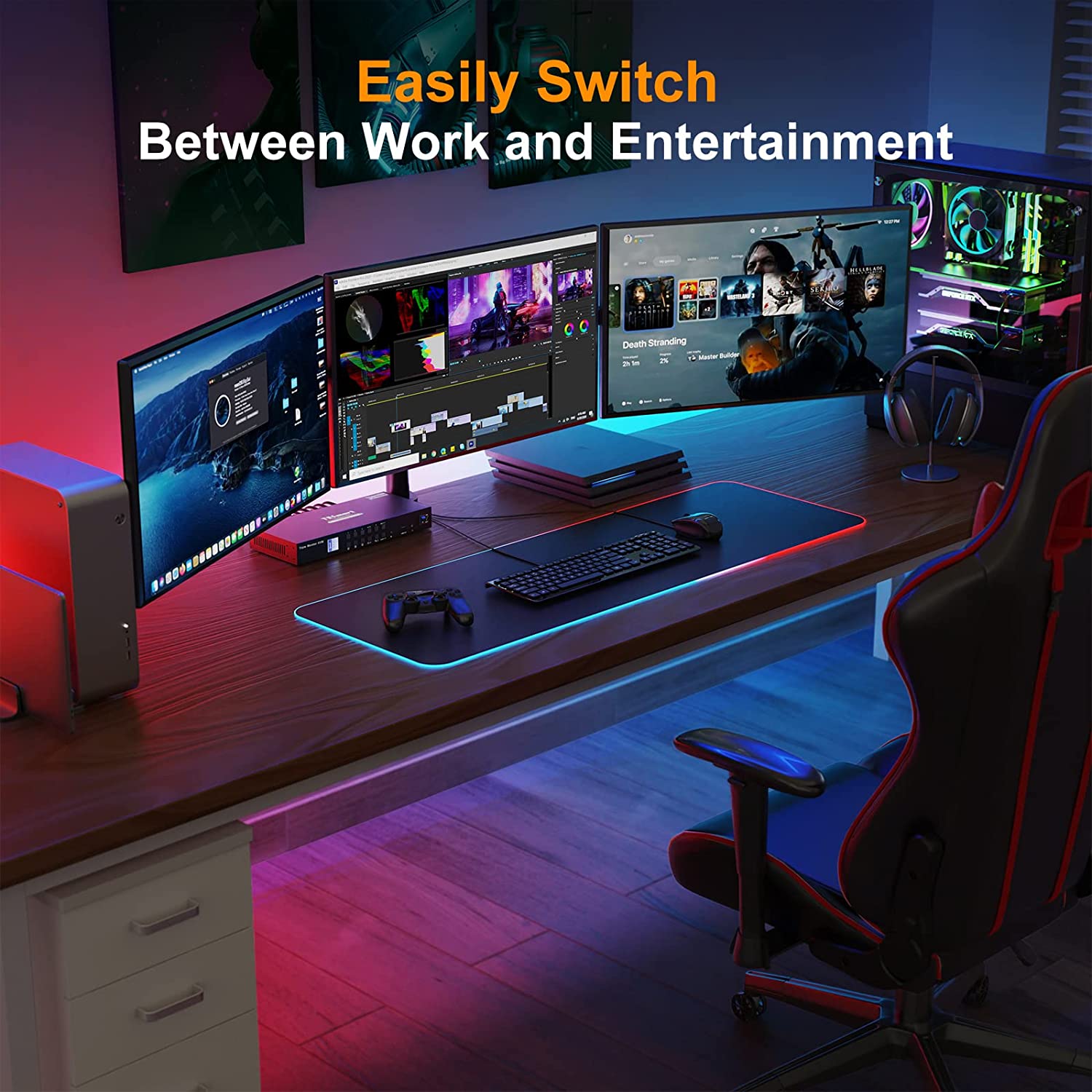 • 【TRIPLE MONITOR KVM SWITCH WITH 2 DISPLAY MODES】Hooking 4 desktops or Laptops to share one set of keyboard, mouse and 3 monitors for extended display or duplicate display or display different PCs on 3 monitors. Each computer needs to have 3 video connection to the triple monitor HDMI KVM.