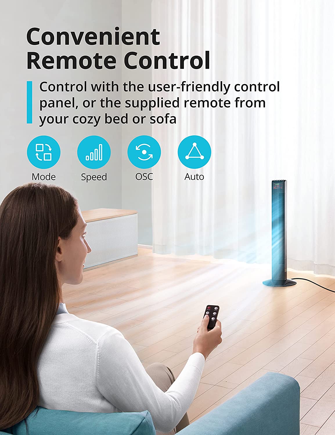 - Simple Controls: Remotely control the strength and oscillation from your bed or sofa; view the room temperature, current mode and speed settings on the large LED screen (light turns auto-off after 30s in sleep mode)