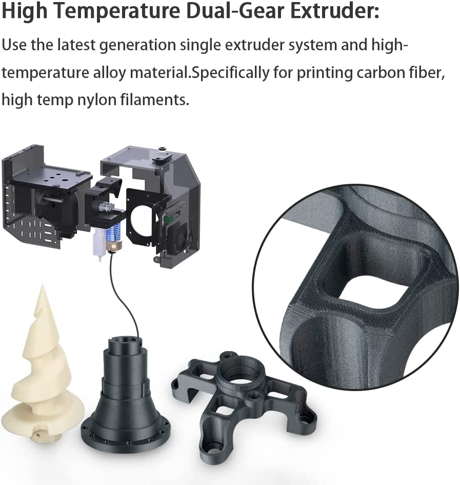 【Design Concept】X-CF PRO is a 3d printer specially designed for printing carbon fiber and nylon filaments.Independent research and development of the latest generation single extruder system, which uses high-temperature alloy material, dual-gear extrusion, can solve the problem of the accuracy is not very accurate or service life is not long when printing carbon fiber. Another set of normal high-speed extruder can easily print PLA, ABS, PETG and other filaments.