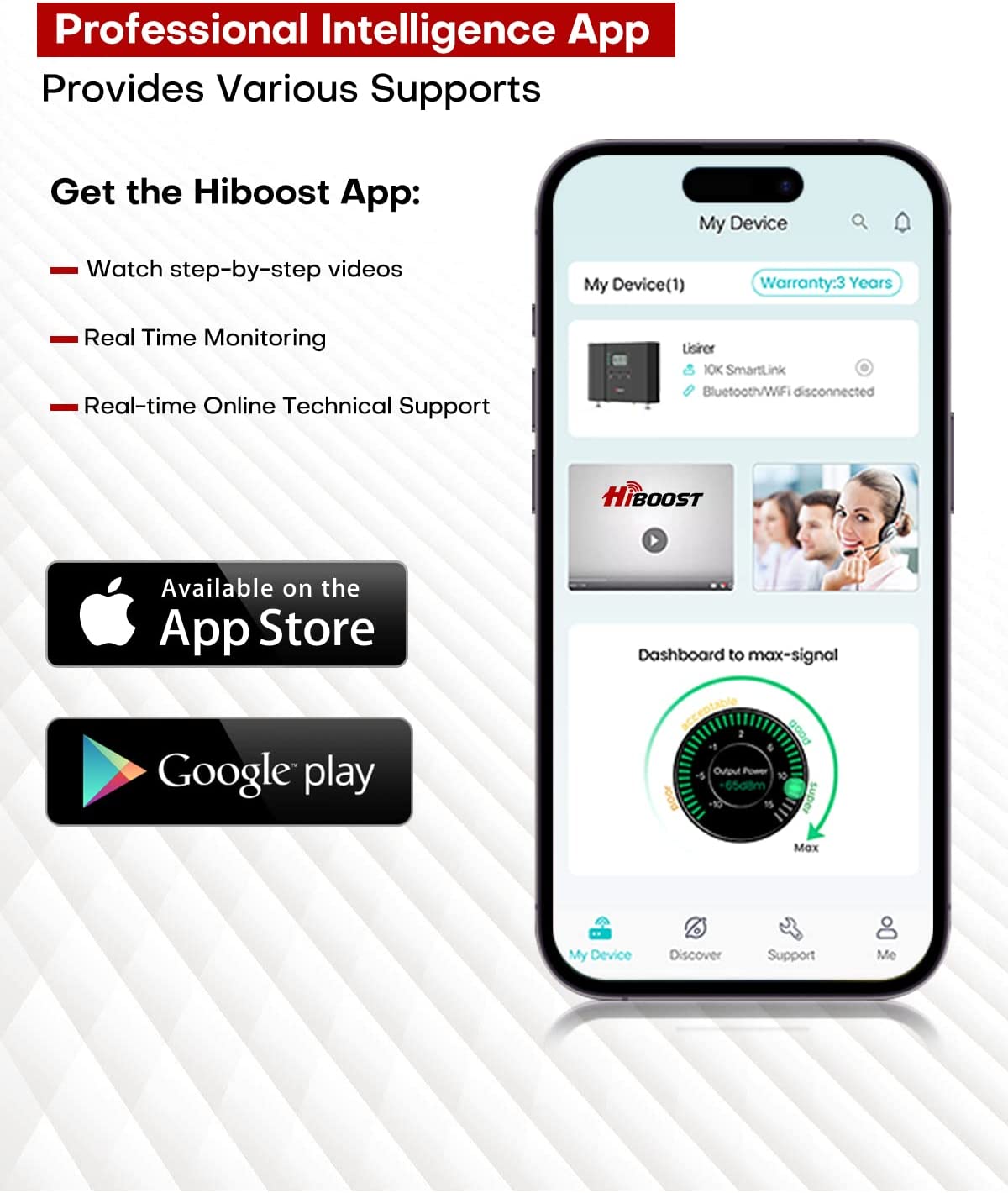 【???? ?? ??????? ???? ??? ??? ???】Hiboost cell phone signal booster has developed its own unique "Signal Supervisor" APP and LCD screen to help you with the installation. You can monitor the real-time status of the cellular booster remotely from your mobile device at any time. the APP allows you to find detailed installation videos for all models of hiboost cell booster and provides live chat and remote assistance.
