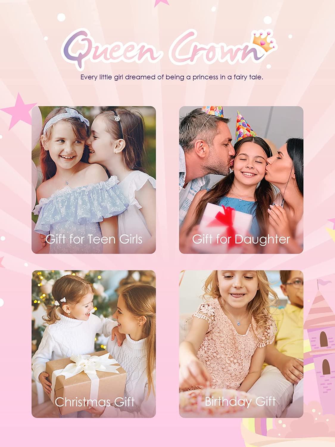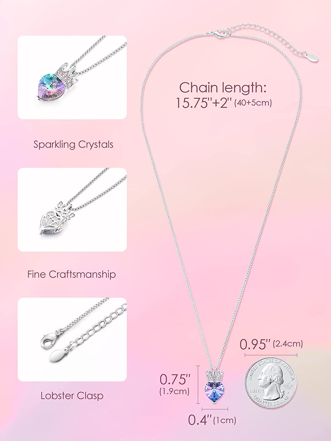 • CROWN HEART NECKLACE: The heart pendant necklace features a dreamy crystal adorned with a small sparkling crown. The graceful crowned heart design expresses that your little girl is a beautiful, kind-hearted, independent and loving little princess.