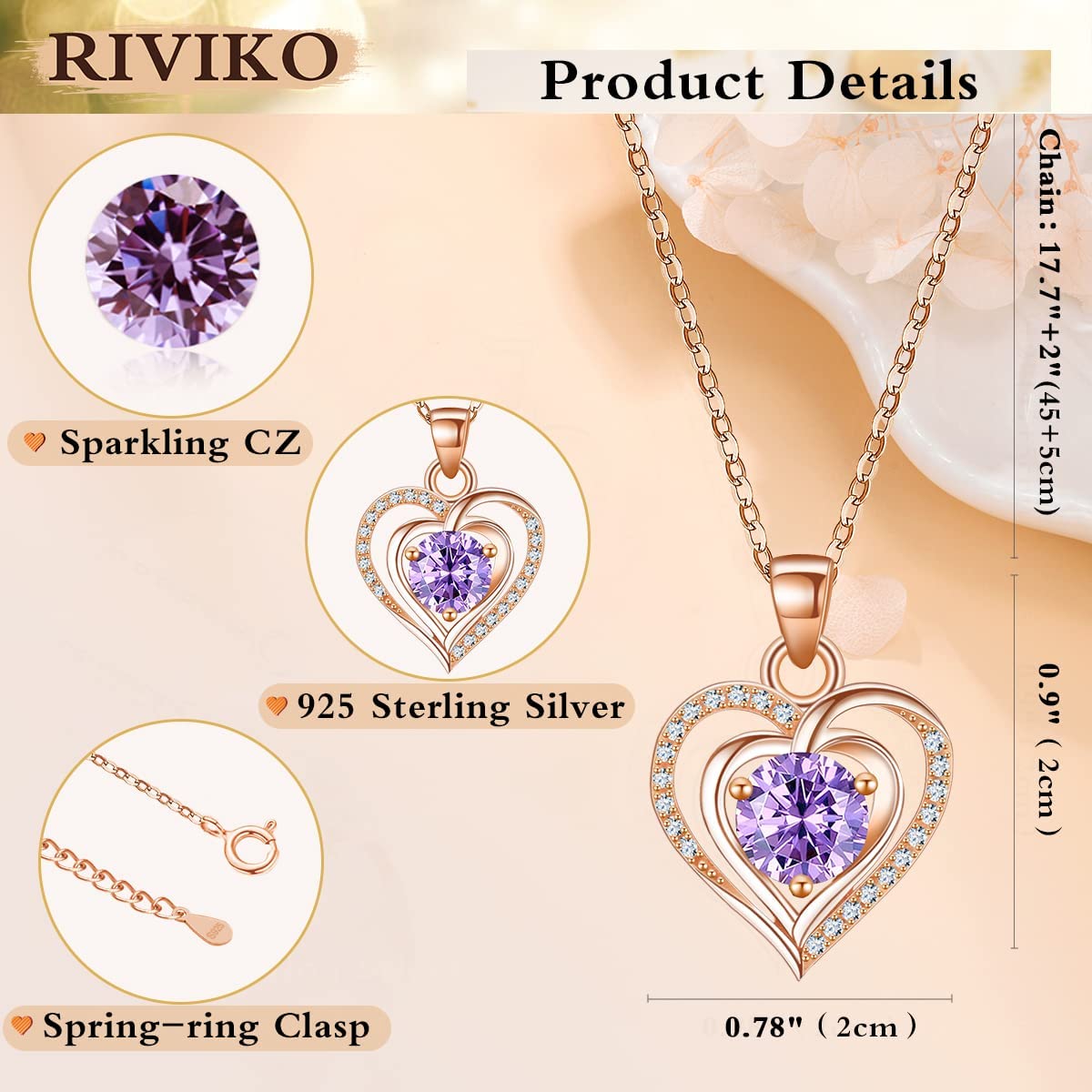 ?【DURABLE 925 STERLING SILVER NECKLACE 】Our birthstone necklace made with sparking zircon stone features 925 sterling silver with high cost rhodium plated chain.These safe materials will not turn your skin green, durable and comfortable to wear it. Pendant Size: 0.9”ⅹ1.02”, Chain Length: 17.7”+2”. The women necklace comes with a navy-blue gift box by RIVIKO.