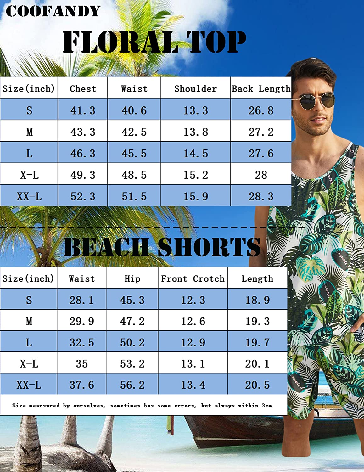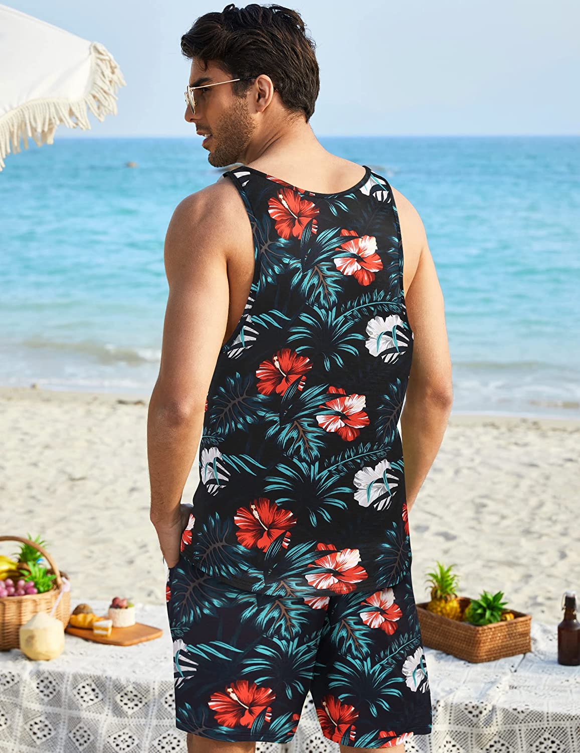 - Summer Tank Tops Beach Shorts Sets --- Men's hawaiian tank top with loose fit, sleeveless, racer back; Beach Shorts with two slanted side pockets, elastic waist drawstring. Simple and fashion matching of tank top and shorts suits, you deserve it in the hot summer.